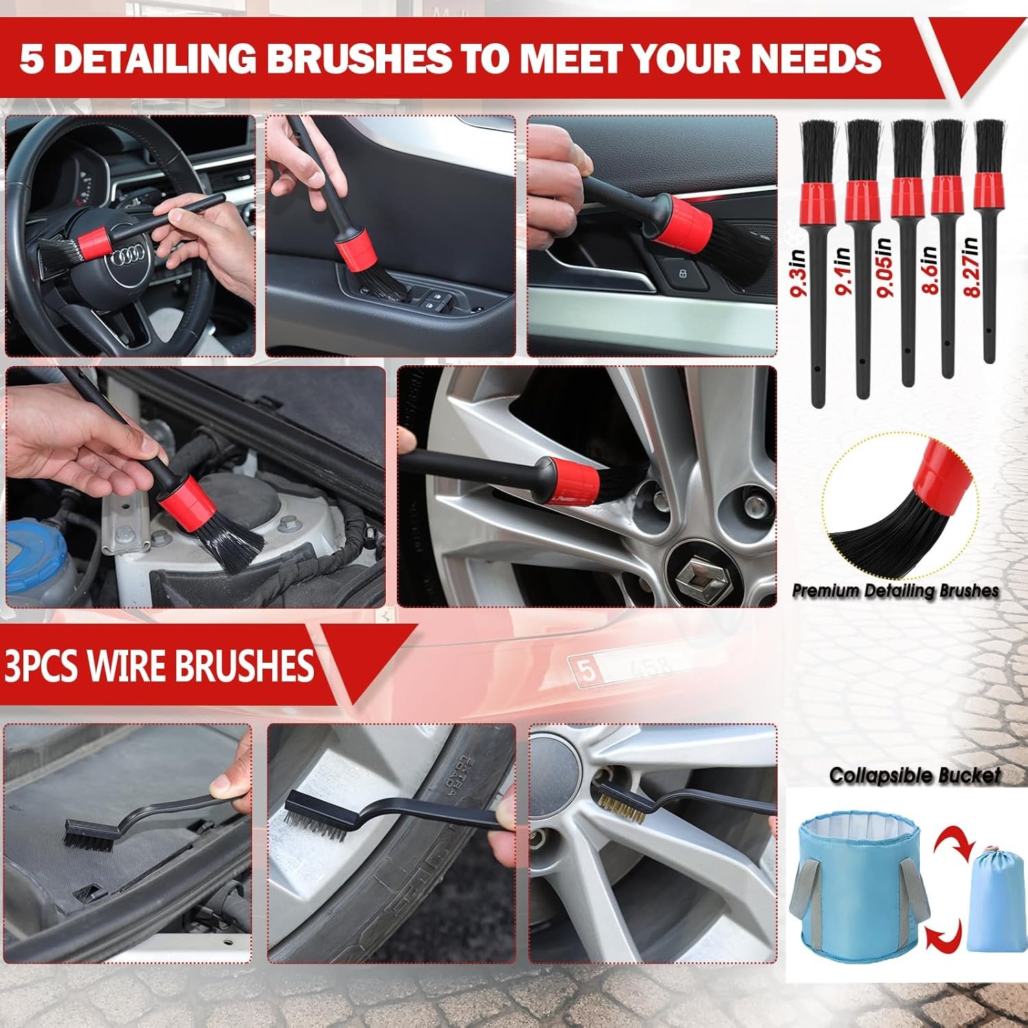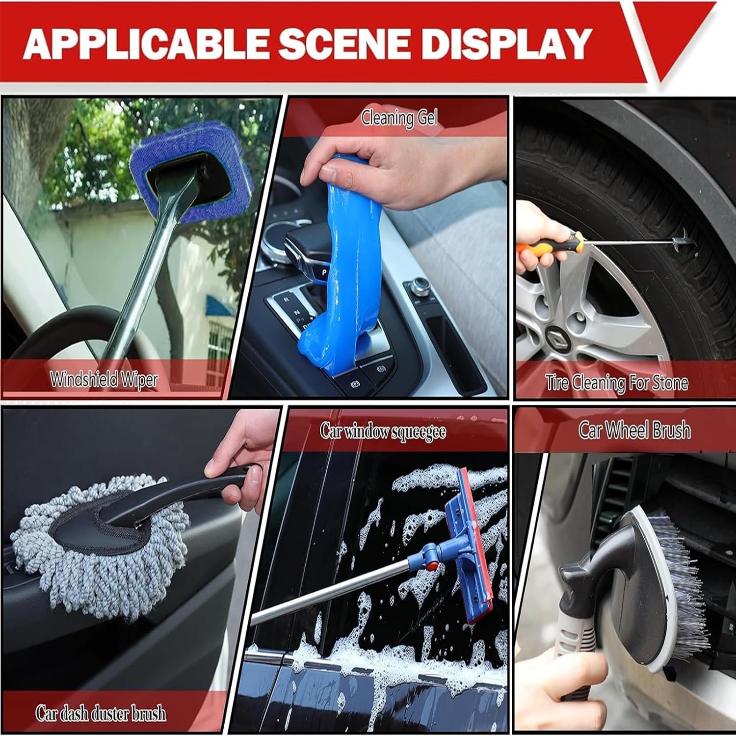 【56Pcs Car Wash Supplies】Still looking for car detailing? This set meets your car wash needs! Durable tool storage bag*1, Car wash foam gun*1, car wash brush with long handle*1(mop head*2), Car dash duster brush*1,Tire Bristles*1,Portable collapsible bucket*1, Car wheel brush*1,Microfiber wash mitt*1,2 In 1 windshield brush*1,Bule Windshied cleaning tool*1(Windshied Head *3), Air vents brush*1, Adjustable twist nozzles*1, Quick coupling*1, Leaking-proof tape*1, Cleaning Stone For Tire*1,Cleaning gel*2, Microfiber towels*2, Wire brushes*3, Leakproof rubber covers *3, Car detailing brushes*5, Quickly Organize Stuff*6, Wax Applicator Pad*6, Glass Washer Cleaning Tablets*10.