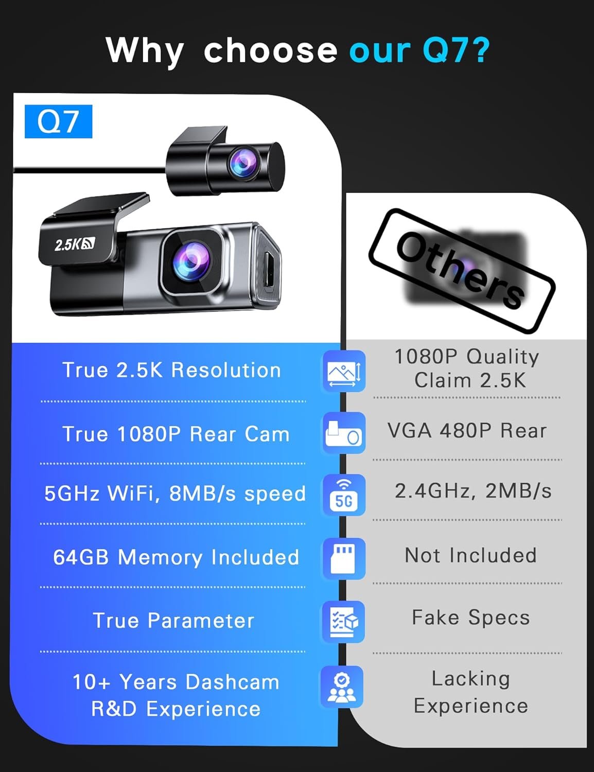【5G WiFi Dash Camera for Cars & App Control】Equiped with cutting edge 5G WiFi module, allow 4x download speed(up to 8 MB/s) compared to other 2.4G. Easily connect to our Q7 dash camera for cars, you can instantly view the live time video from the front and rear side of your car, and adjust the settings of the Q7 car camera. With a few simple taps, you can download the albums from the app, edit them, and share them on social media.