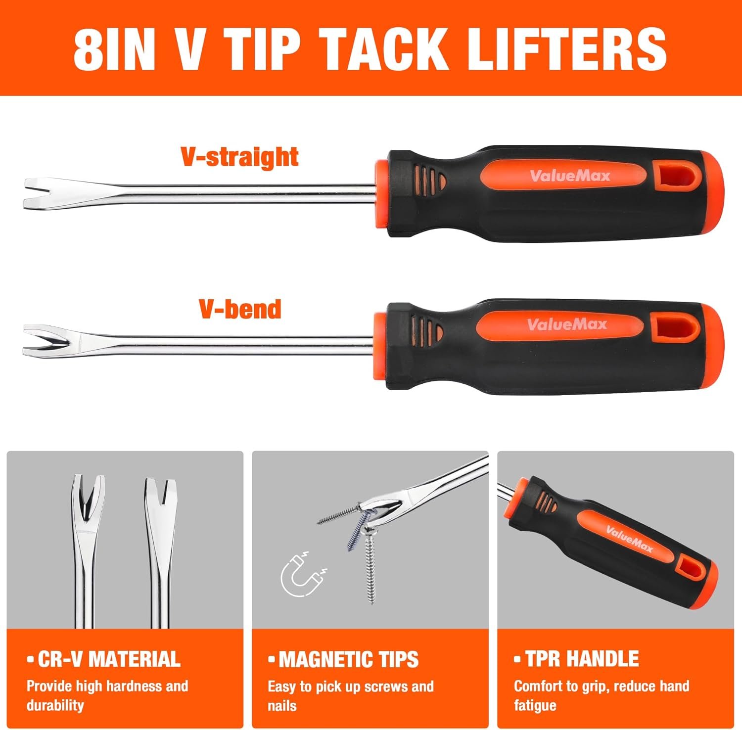 Tack Lifter: Two different shaped tips allow them to act on various types of fasteners. Straight V-tips are ideal for pulling nails that are on a flat surface, and the sharp tips help you wedge under tight nails and pull them up easily. The curved V-head has a bend that grips the nail securely and provides leverage when you pull any staple, tack or nail