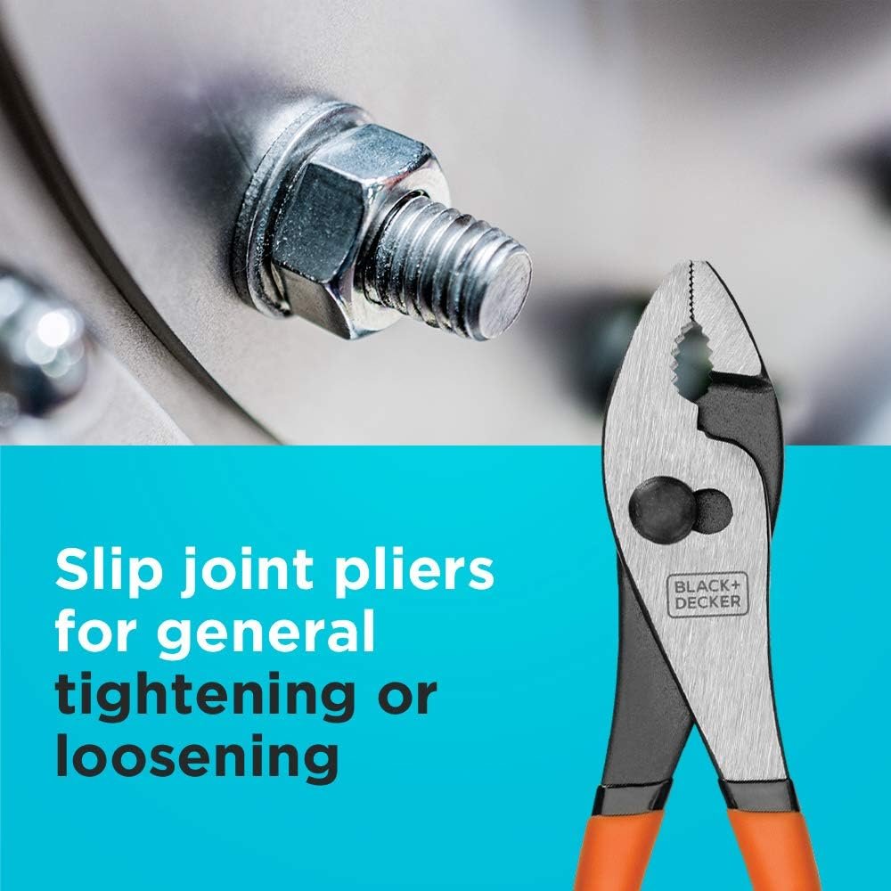 The BLACK+DECKER 4 Pc. Plier Set is a great addition to your toolbox that will allow you to tackle a wide variety of tasks ranging from fastening to wire cutting. The set includes 4 different types of pliers: 8 in. slip joint meant for general purpose use gripping hardware, 7 in. linesman used for gripping flat objects and cutting wires using the side cutters, 6 in. needle nose best suited for precision work in hard to reach places and 6 in. diagonal meant for cutting.