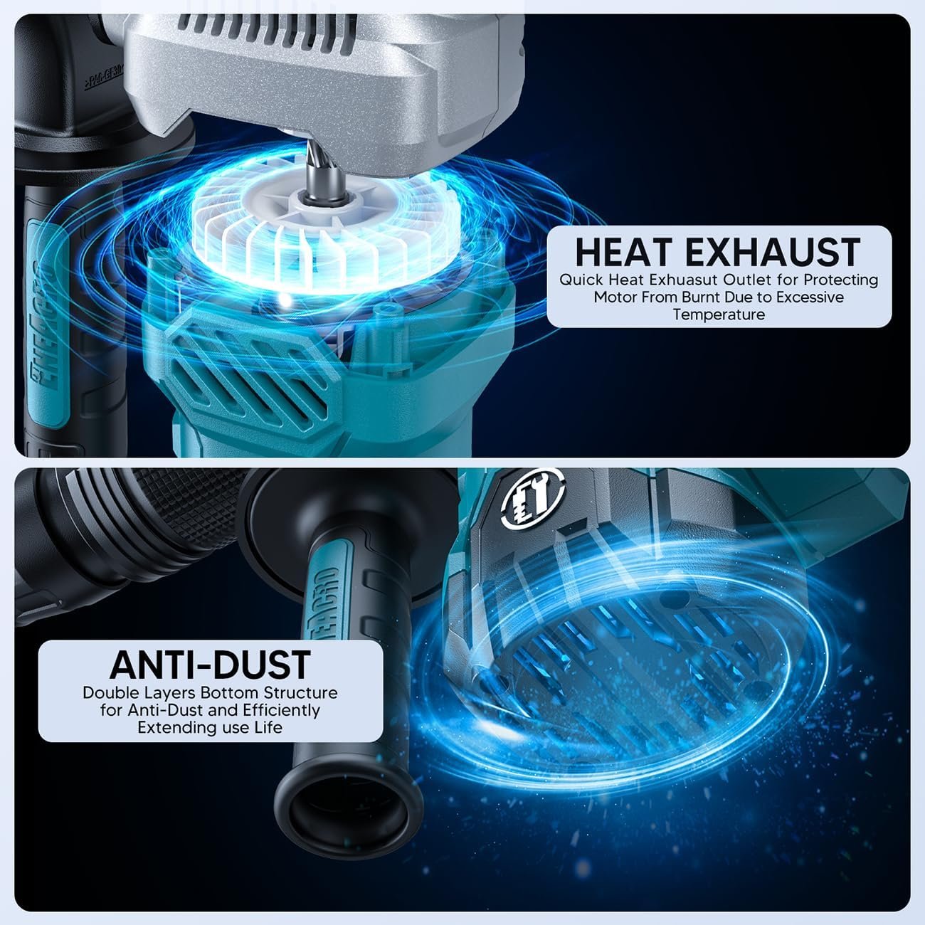 【THOUGHTFUL HUMANIZED DESIGN】With an anti-scald front housing, 0845MB jack hammer is designed to protect the user from potential burns. And the 360° adjustable handle is designed for both horizontal and vertical demolitions. The upgraded anti-vibration system and PU soft grip significantly reduce fatigue, while the aluminum alloy shell ensures durability and resilience, even if accidentally dropped