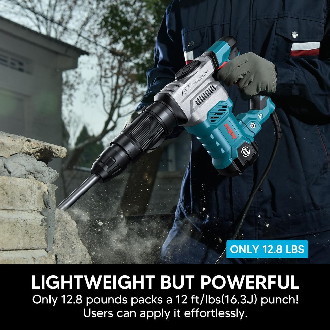 【SAY GOODBYE TO BULKY MACHINES】At just 12.8 lbs, this lightweight demolition jack hammer is easy to control and handle. It’s equipped with an 11Amp industrial motor and a heat-resistant copper wire motor, delivering 4100BPM, 11.6ft/lbs(15.7 Joule) of concrete-breaking power. Perfect for medium-duty work projects, this powerful tool is designed to enhance convenience and efficiency