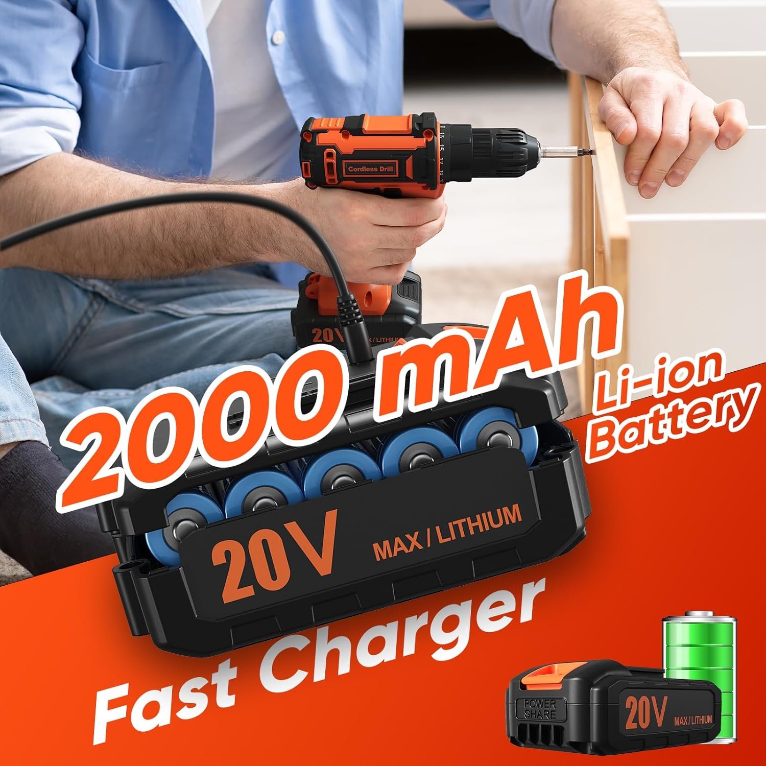 Cordless Drill Set, 20V Power Drill with Battery 2.0Ah and Charger, 3/8-Inch Keyless Chuck Electric drill, 25+1 Position, 42pcs Drilldriver Bits/Screws for DIY Projects (Orange)