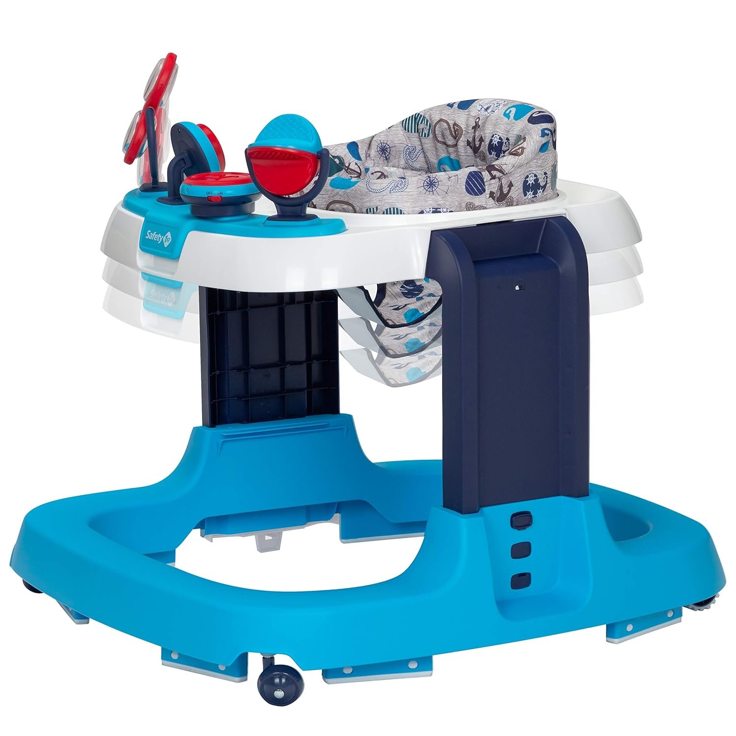 The Safety 1st Ready, Set, Walk DX Developmental Walker is a great companion for your little one’s first steps. This baby walker with wheels is a versatile choice among baby walkers for boys and baby walkers for girls. The extra-wide base provides stability as they explore their surroundings. This walker for baby boy or girl is equipped with an activity center that includes 3 developmental toys, offering a baby activity walker experience full of fun and learning that provides sensory and tactile stimulation, and helps develop gross motor skills, and problem solving. The crevice-free, easy-wipe activity tray and the machine-washable seat pad make clean-up a breeze. From snacks to play, the large tray provides ample space for your baby to enjoy their favorite walking toys. Whether you’re looking for a baby girl walker, walker baby, or walking toys for babies, it’s a reliable walker for baby girl or boy. As one of the most dependable walkers for babies, it nests into a compact shape for storage or traveling. It’s an excellent option for babies getting ready to walk. Use only for a child who can hold their head upright unassisted and who is not able to walk or climb out of the product, up to 30 lbs. Or 32″.