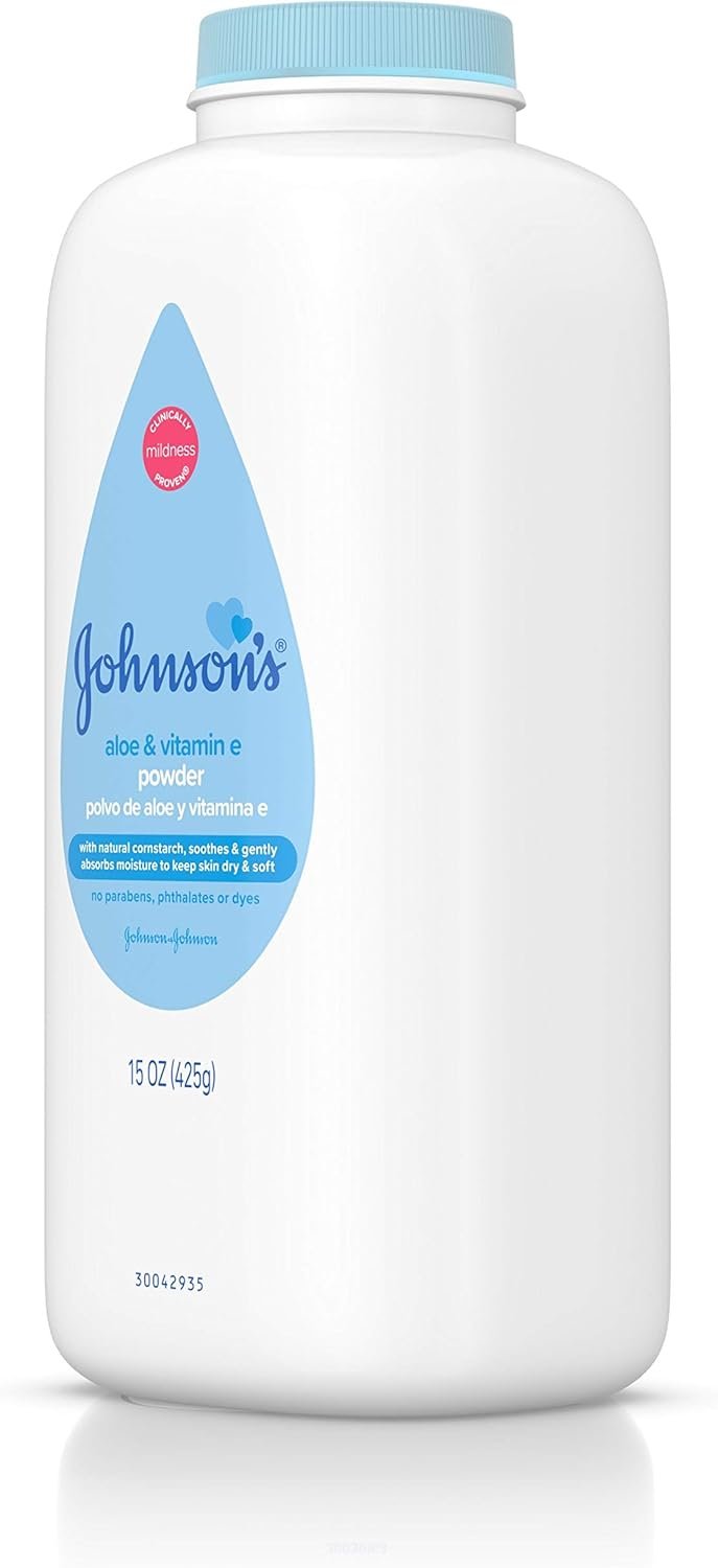 Johnson’s Baby Powder, Naturally Derived Cornstarch with Aloe & Vitamin E for Delicate Skin, Hypoallergenic and Free of Parabens, Phthalates, and Dyes for Gentle Baby Skin Care, 15 oz