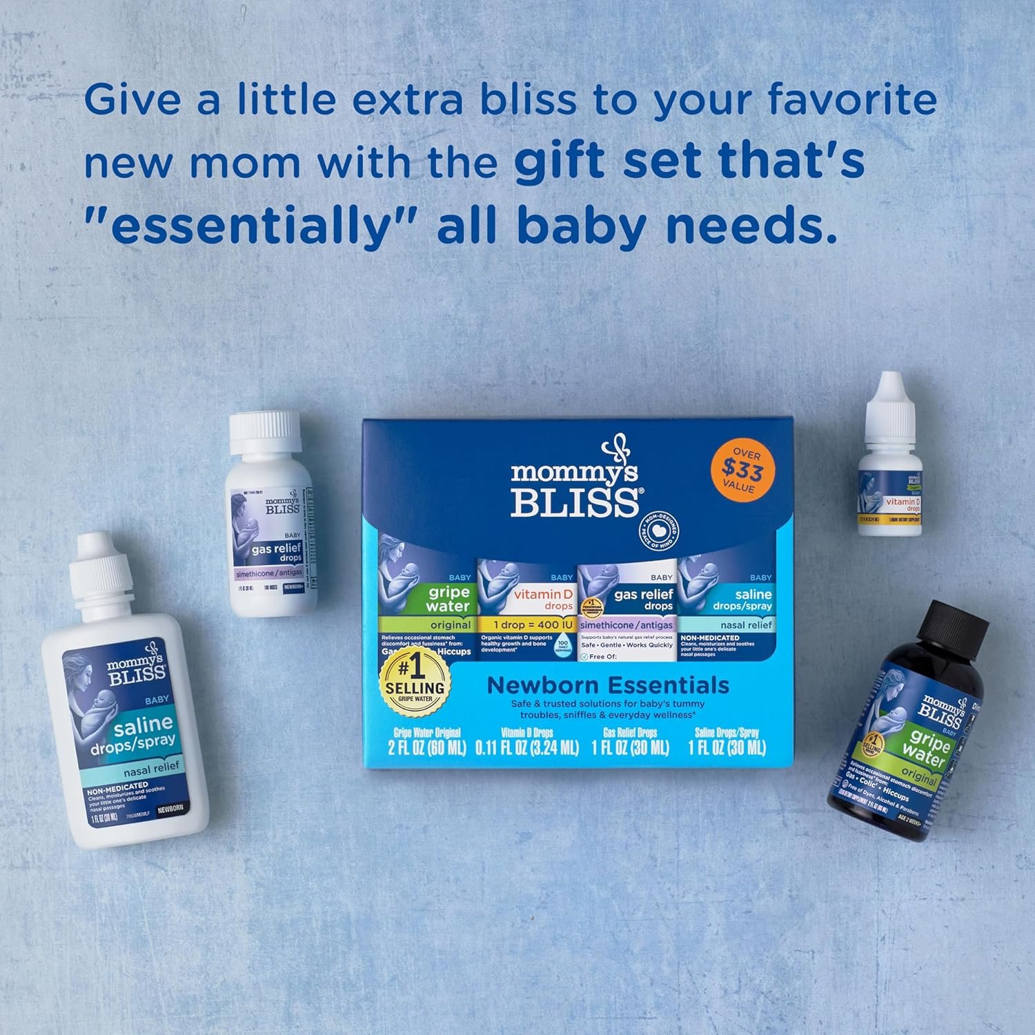 Mommy’s Bliss Newborn Essentials Gift Set, Includes Gripe Water, Baby Vitamin D/Gas Drops and Gentle Saline Drops/Spray
