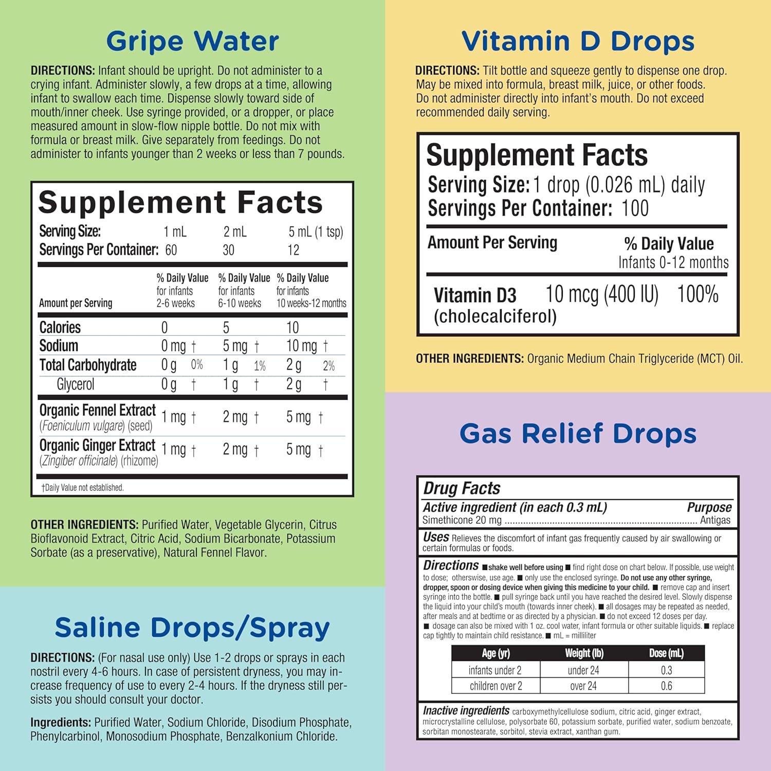 Gripe Water Original: Tamper evident: this product has a safety seal for your protection. Do not use if seal is broken or missing. Caution: Keep this and all supplements out of the reach of children. Do not exceed recommended daily servings. Since infants have immature immune systems, a possibility exists that an infant may have a rare allergic reaction. Always consult your healthcare provider prior to giving this or any supplement to an infant. Vitamin D Organic Drops: Caution: Keep out of reach of children. Please consult your doctor prior to use. Storage: Store in a cool dry place. Recap tightly. Gas Relief Drops: Keep out of reach of children. Overdose warning: Quick medical attention is critical even if you do not notice any sign or symptoms. Saline Drops/Spray: Keep out of reach of children. The use of this dispenser by more than one person may spread infection. Wipe nozzle clean after each use.