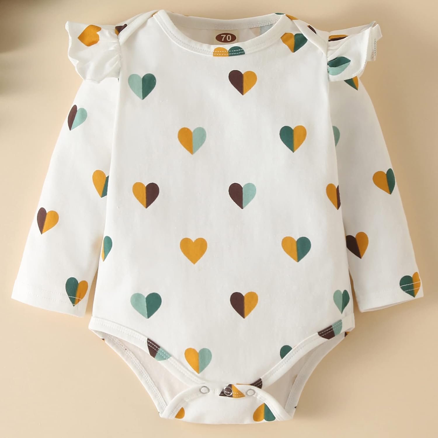 Are you looking for something durable, easy to wash, and infinitely cool for your little princess? She will grow up and be a Queen! We designed these amazingly beautiful CUTE BABY GIRL CLOTHES to brighten your cute little one’s day up a bit. Our cute fall baby girl clothes will make your little one charming and active on spring,fall/winter days.These perfect baby girl outfits have snap-up onesies for easier diaper changes. It is also embellished with heart print for an exceptional look. The ruffled layered shoulder long sleeve romper and frill pants will highlight your beauty. It is completed with matching bow headbands, you can’t go wrong.These adorable 3pcs clothes for baby girls are perfect for spring fall winter; only the best for a future Queen! We love this style with some toddler shoes, statement accessories, and shades for a look that we are loving.