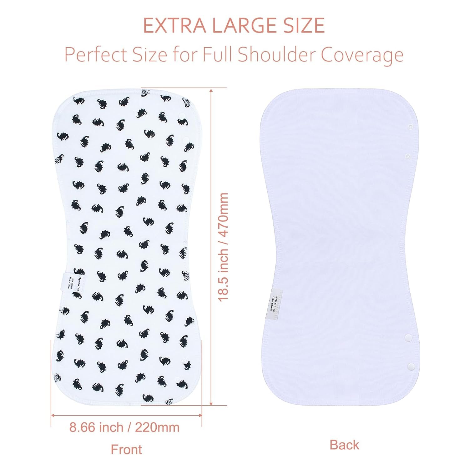【BURP CLOTHS AND BIBS ARE PERFECT SIZE AND DESIGN】Each set of burp cloths comes in a 12 pack, extra-large size 8.66 X 18.5 inches. The center curve is shaped and sized so it covers your entire shoulder or forearm while holding your baby or burping, and it won’t slide. No more burps and spit-ups staining baby’s clothes and mom’s clothes, ideal for absorbing messy drool