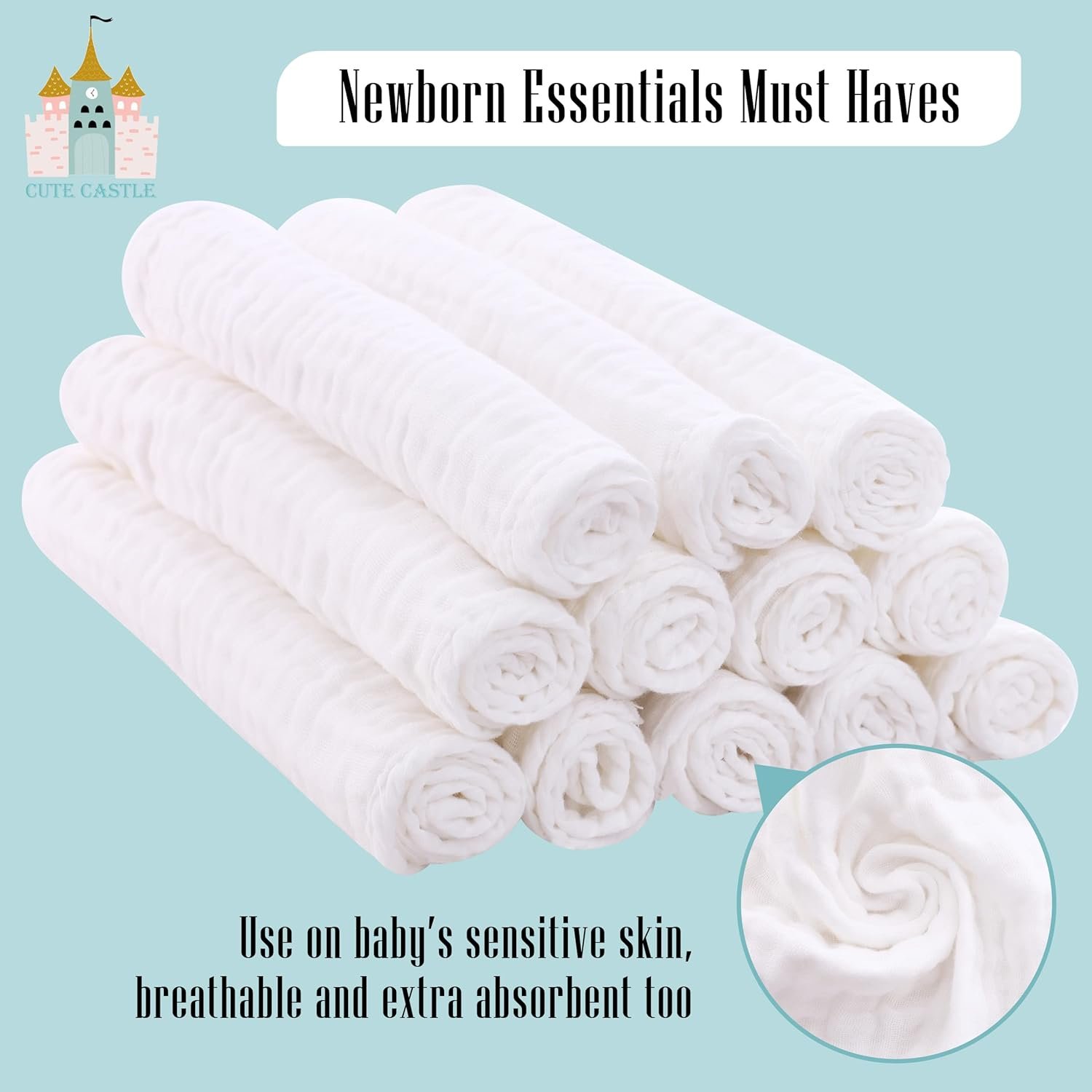 Cute Castle 12 Pack Muslin Burp Cloths for Baby – Ultra-Soft 100% Cotton Baby Washcloths – Large 20” by 10” Super Absorbent Milk Spit Up Rags – Burpy Cloths for Unisex, Boy, Girl – White