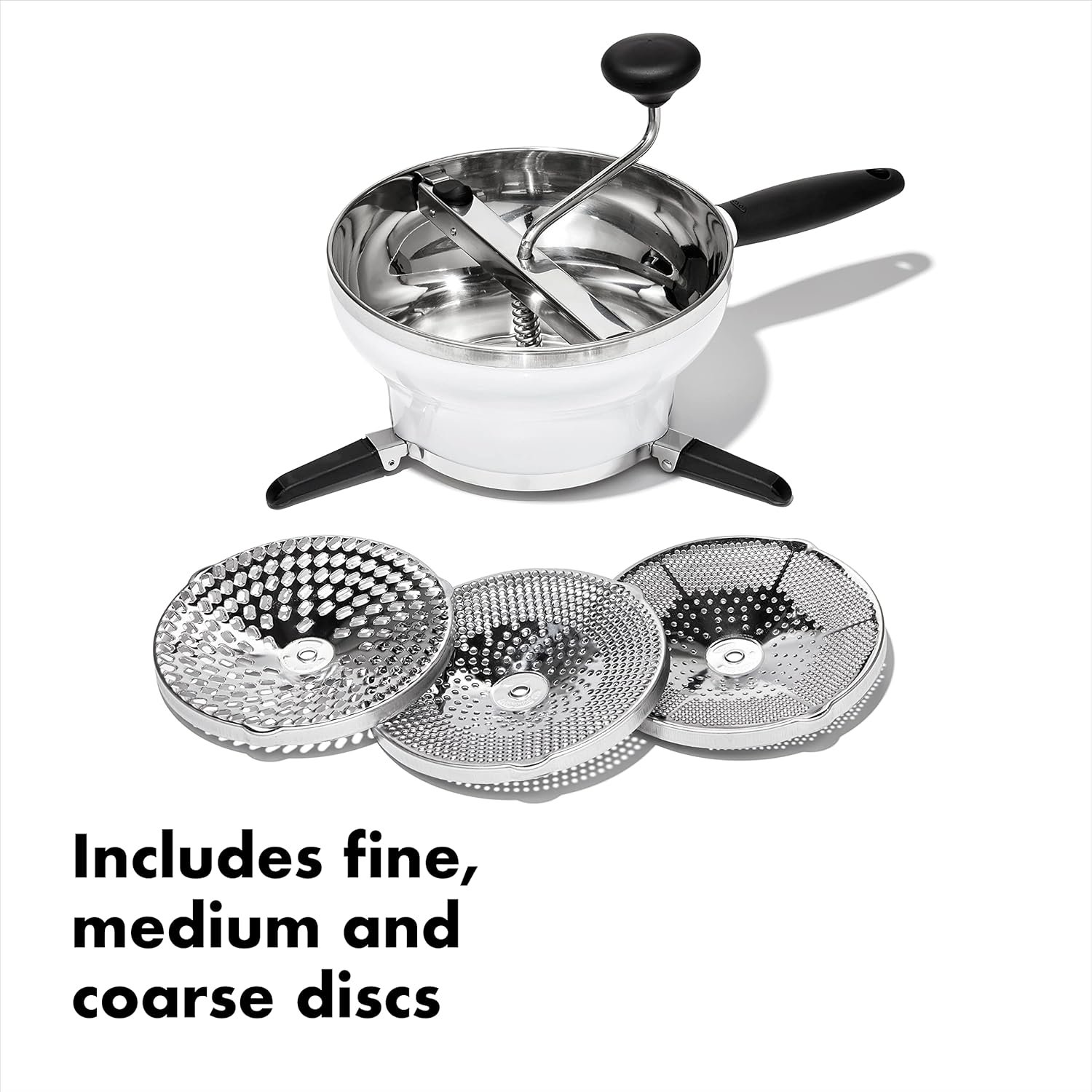 The OXO Good Grips Food Mill is the perfect tool for preparing fresh purees, sauces, soups and more. It has a stainless steel inner bowl that is ideal for hot foods and will not stain, and includes 3 stainless steel grinding discs for fine, medium and coarse textures. Use the fine disc for homemade jellies, creamy sauces and baby food, the medium disc for applesauce and vegetable soups, and the coarse disc for mashed potatoes and chunkier sauces. The Food Mill has a unique release button that makes it easy to exchange discs and disassemble for storage. Three non-slip legs hold the Food Mill securely over bowls and pots up to 11 inches in diameter, keeping it out of your food. The legs also fold for easy storage. The soft, non-slip handle and knob ensure comfort when gripping the Food Mill and turning the blade. All parts are dishwasher-safe.