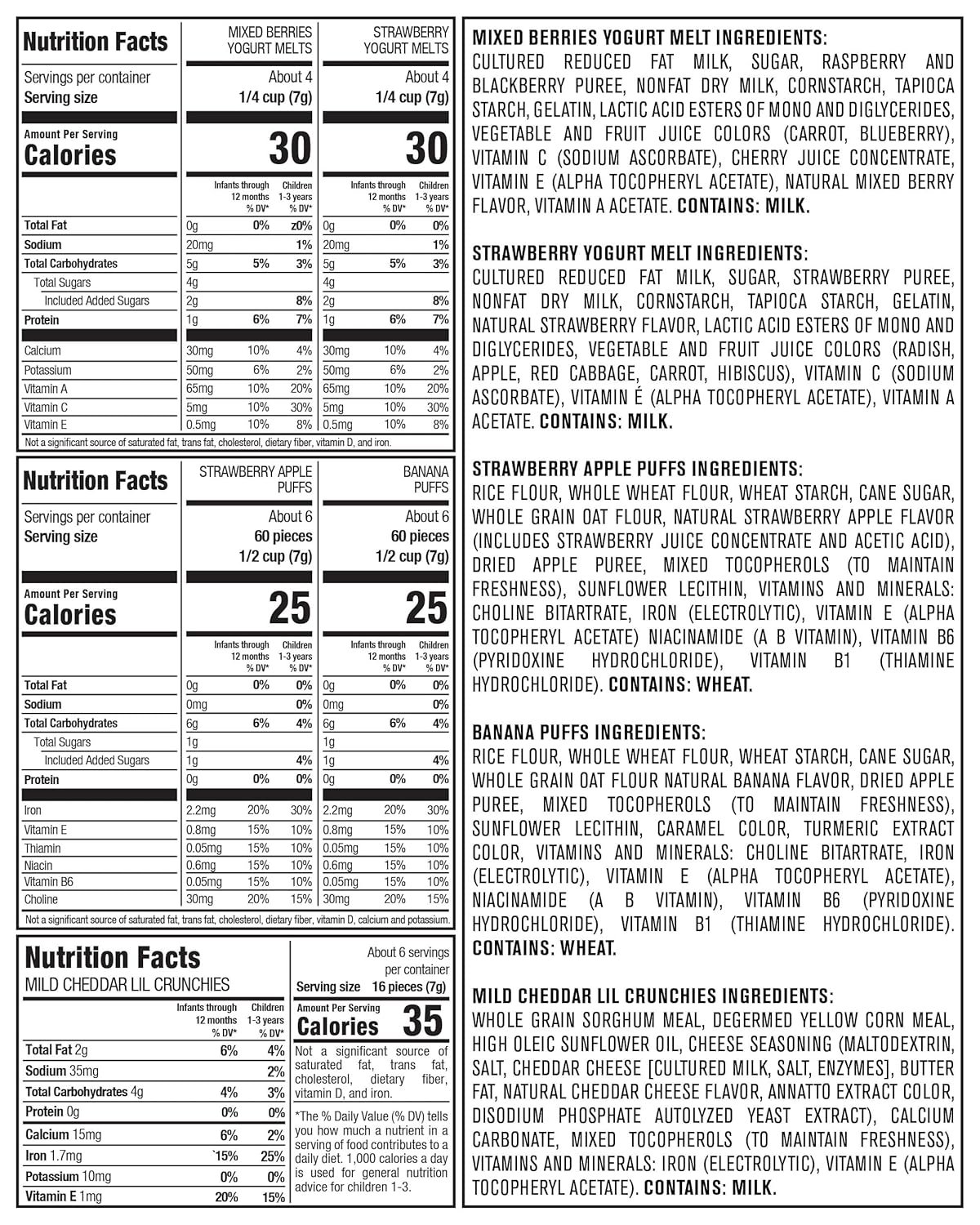 Variety pack: This 9Count variety pack, contains 3-1.48 ounce mild Cheddar Lil Crunchies, 2-1.48 ounce strawberry apple puffs, 1-1.48 ounce banana puffs, 2-1 ounce strawberry yogurt melts and 1-1 ounce mixed berry yogurt melts