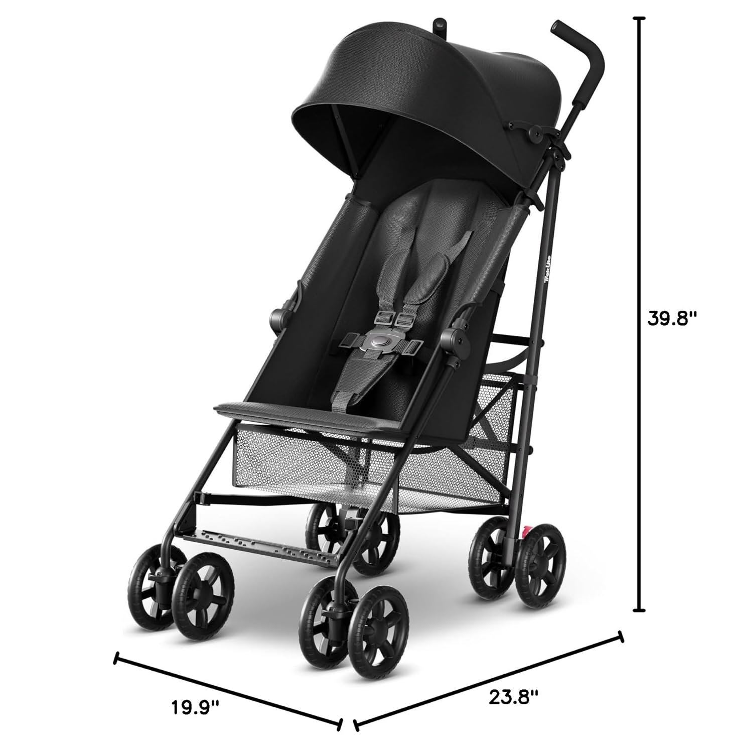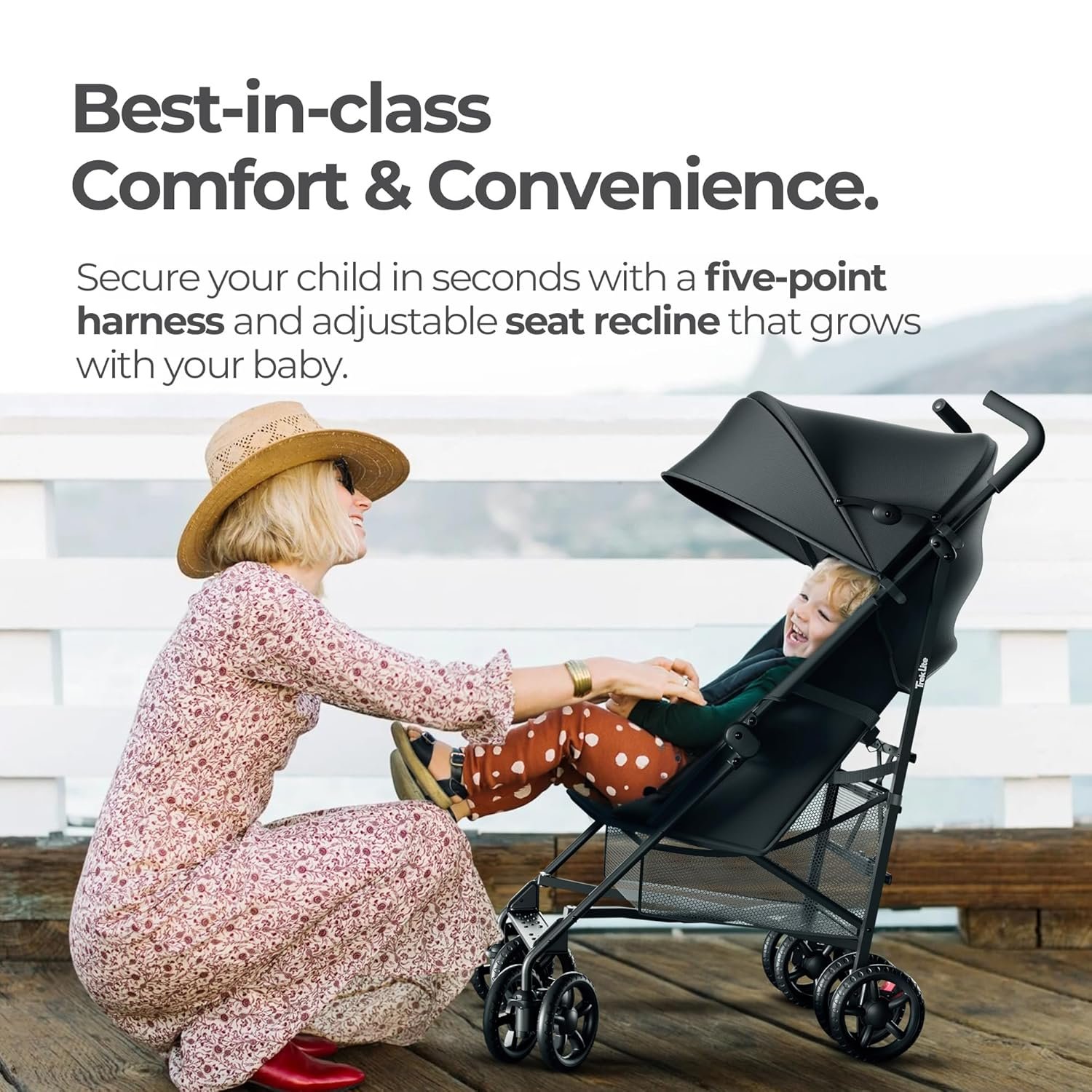 Cuddle in Motion: Ensures your child’s comfort with multi-recline positions, perfect for on-the-go naps. The Trek Lite compact stroller features a large UPF 50+ canopy for protection and a five-point harness for safety, adjusting easily as your child grows