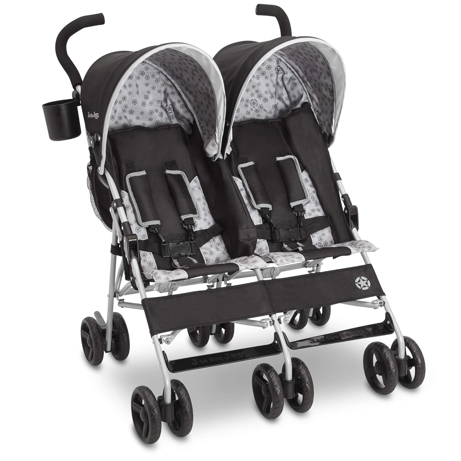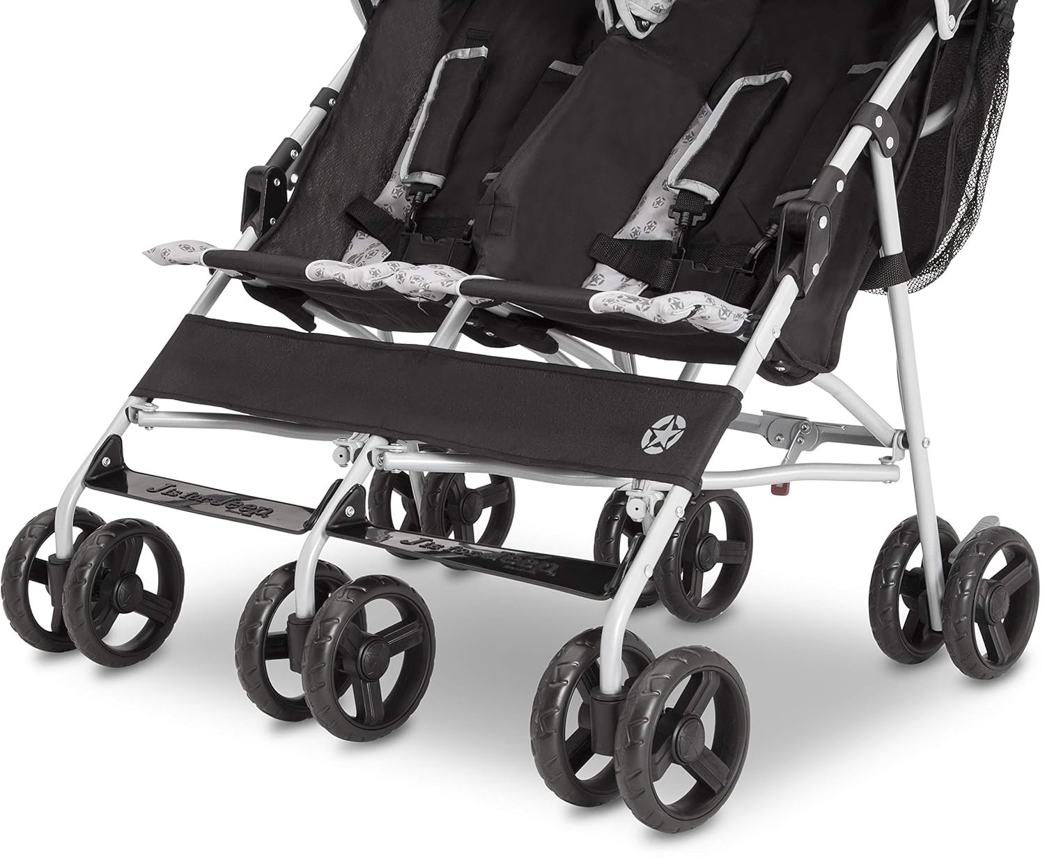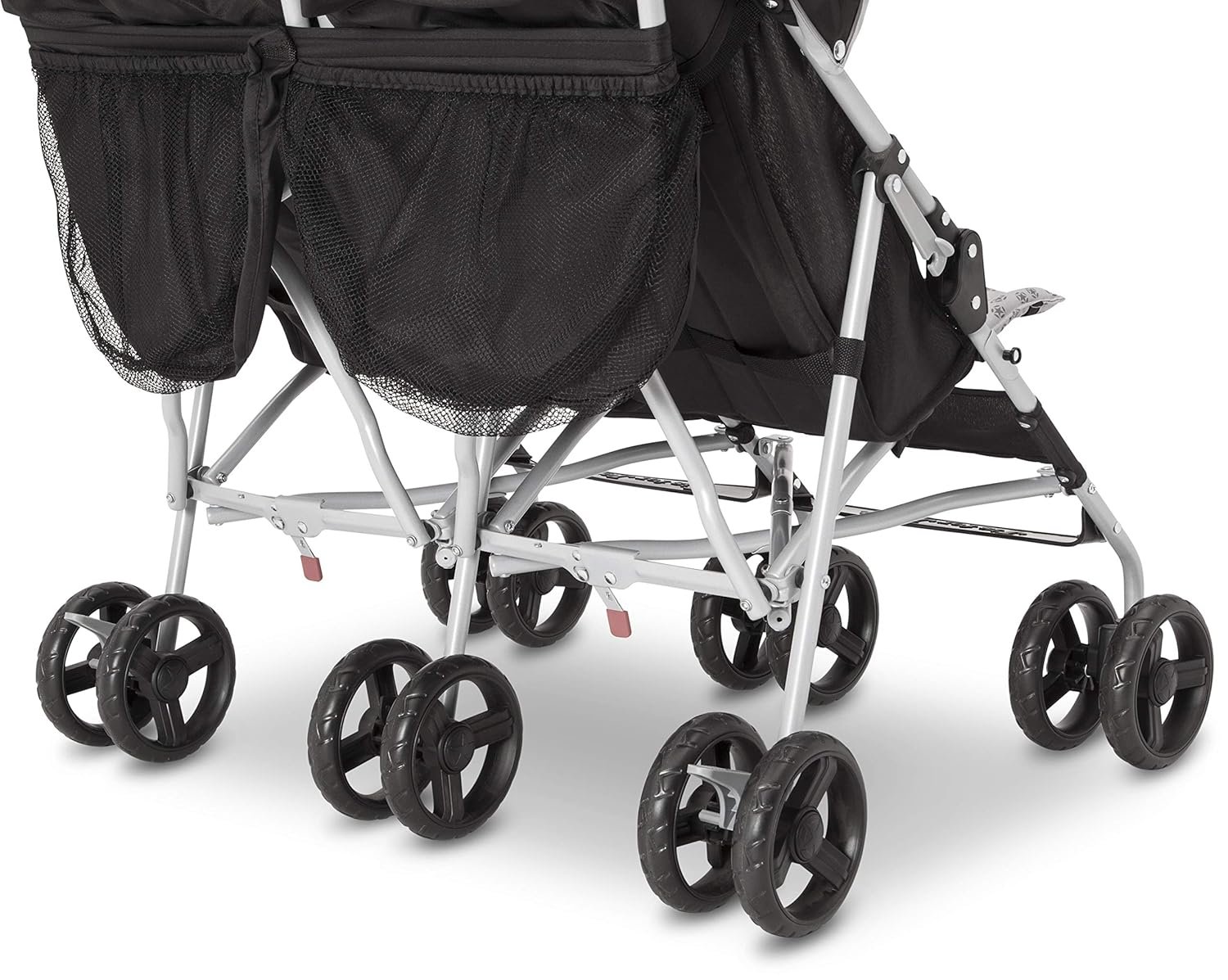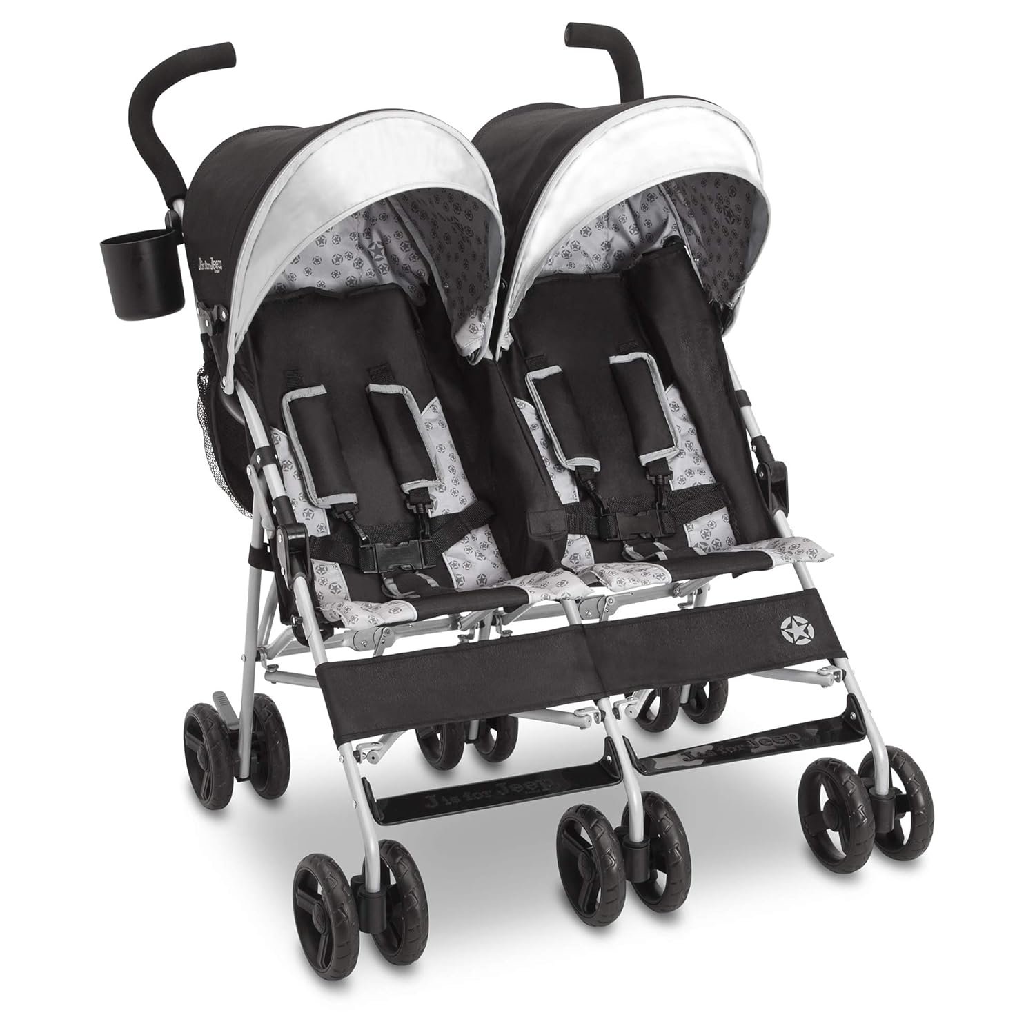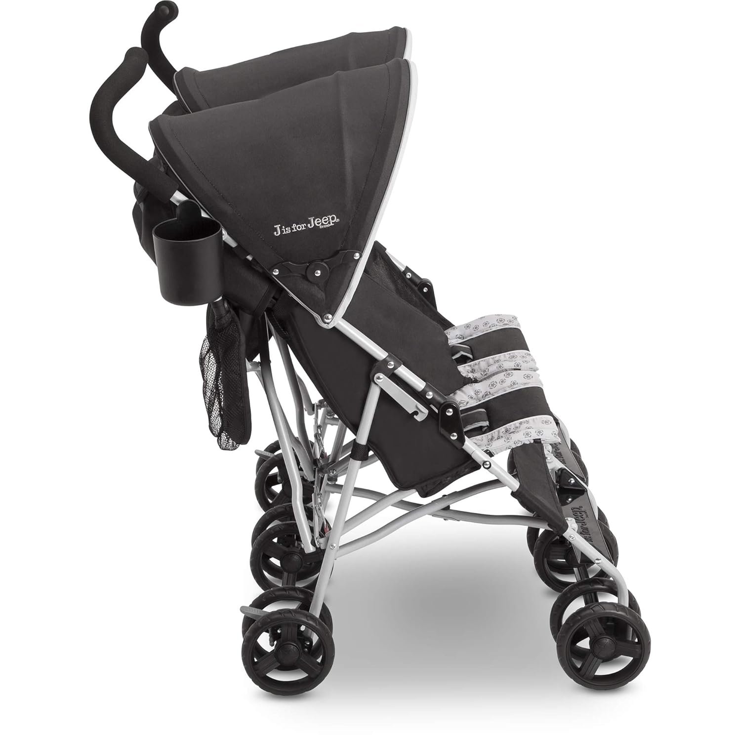 Epic family adventures are easy with the J is for Jeep Brand Scout Double Stroller from Delta Children. The stroller is finished with exclusive accents, including an extendable European-style canopy, reclining seat with multiple positions and reflective piping to help you and your children stand out from the crowd. Awesome 5.5-inch wheels with front swivel and suspension allow you to effortlessly discover everything that’s out there. Lightweight and capable of explorations near or far-the J is for Jeep Brand Scout Double Stroller is outfitted with abundance of storage options, so you can get your children and all their gear where they need go. Each seat holds up to 35 lbs.