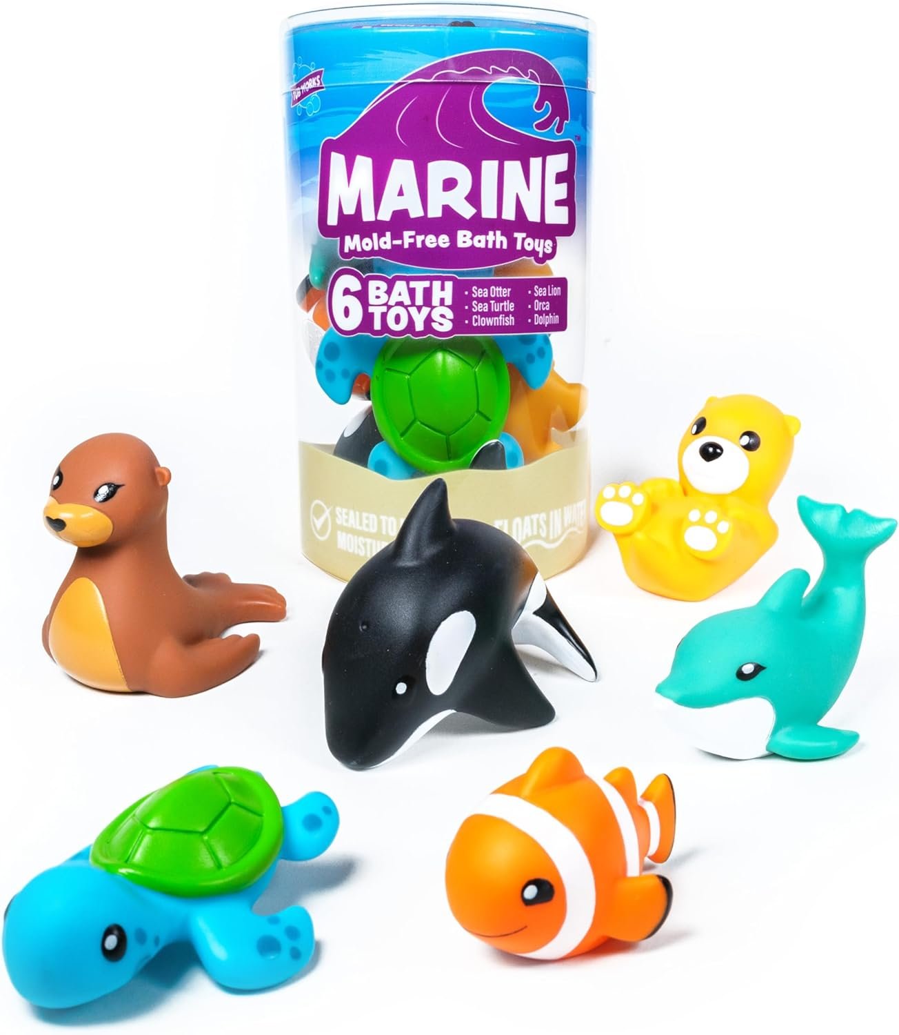 Tub Works® Marine™ Mold Free Bath Toys, 6 Pack | Sealed, No Hole Bath Toys Design Keeps Moisture Out | Soft, Squeezable & Float on Water | Easy-Grip Baby & Toddler Bath Toy Set | Great Baby Pool Toys