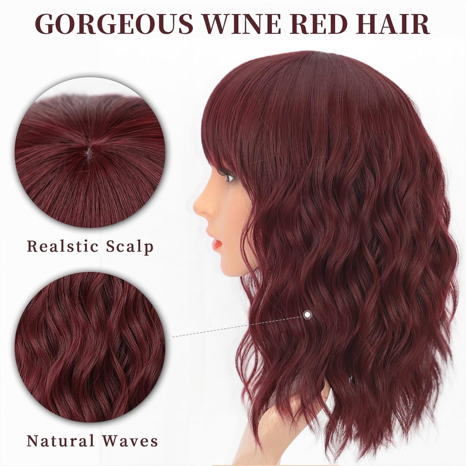 AISI HAIR Curly Bob Wig with Bangs Short Wavy Wine Red Color Wigs for Women Bob Style Synthetic Heat Resistant Bob Wigs