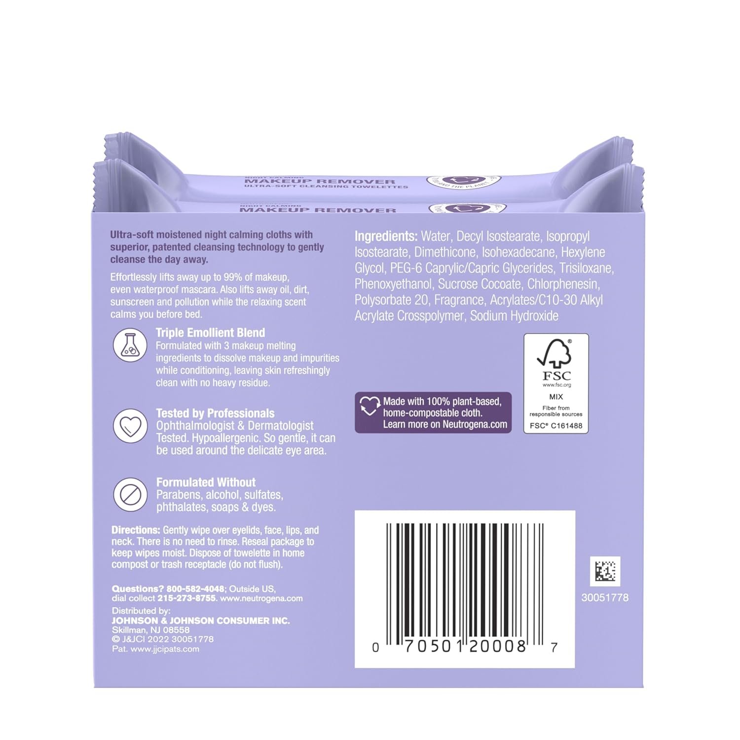 Twin pack of two, 25-count packages of ultra-soft, pre-moistened Neutrogena Makeup Remover Night Calming Cleansing Face Wipes with superior, patented makeup removal and cleansing technology that removes up to 99% of dirt and impurities