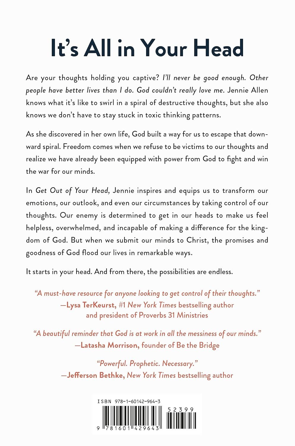 In Get Out of Your Head, Jennie inspires and equips us to transform our emotions, our outlook, and even our circumstances by taking control of our thoughts. Our enemy is determined to get in our heads to make us feel helpless, overwhelmed, and incapable of making a difference for the kingdom of God. But when we submit our minds to Christ, the promises and goodness of God flood our lives in remarkable ways.