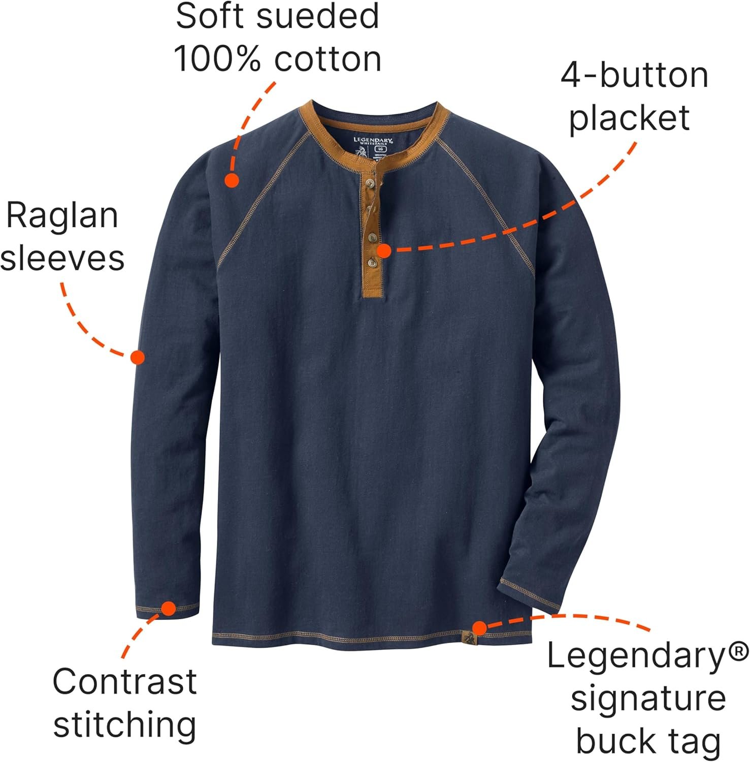 We promised you great everyday apparel for hunters, this piece is no exception. Distressed seams give this men’s Henley a rugged look, while sueded cotton gives it a soft feel. It’s a perfect fit for your outdoor lifestyle, with easy-moving raglan long sleeves and a 4-button placket for easy on/off. Contrast stitching, Legendary label at hem. Big & Tall sizes are designed for men over 6’2″ and add 2″ in body length and 1-1⁄2″ in sleeve length.
