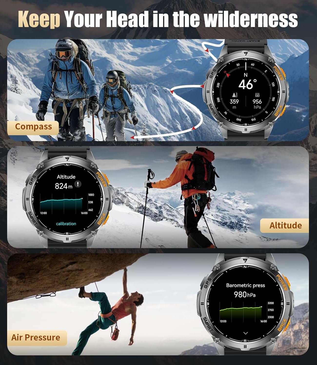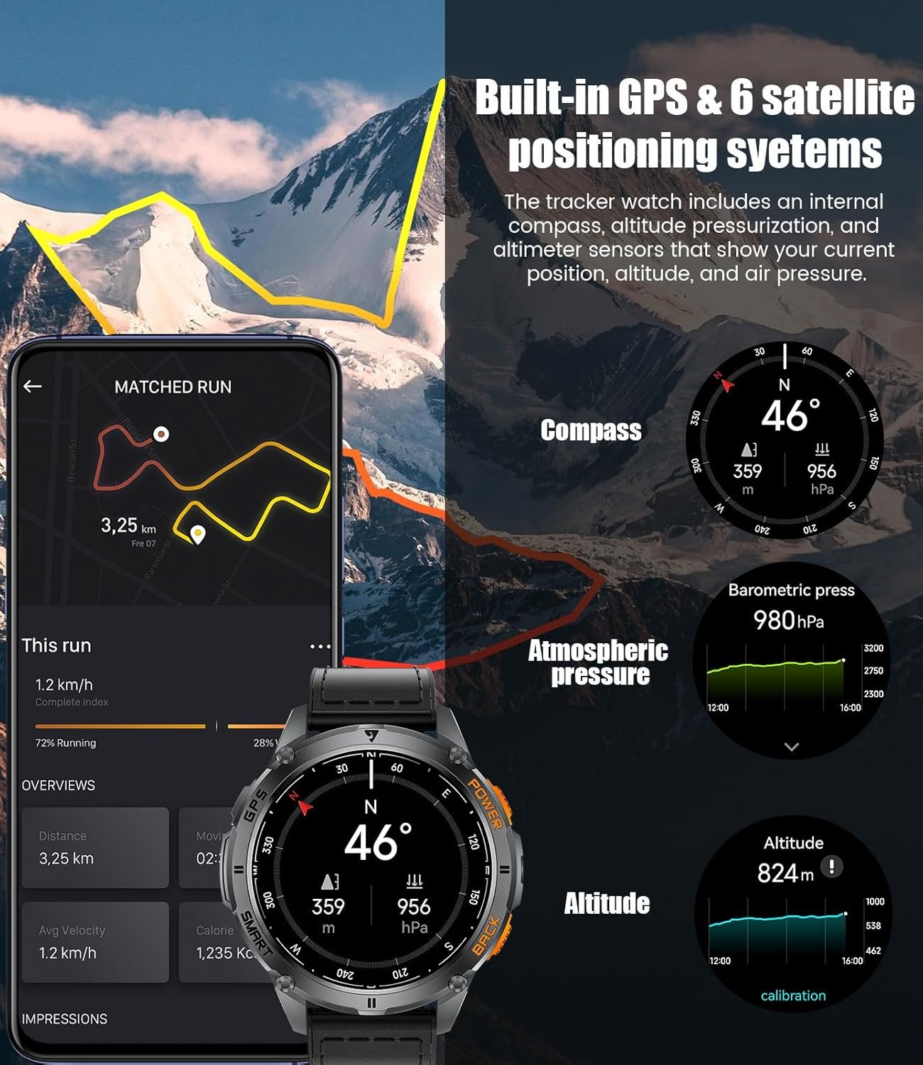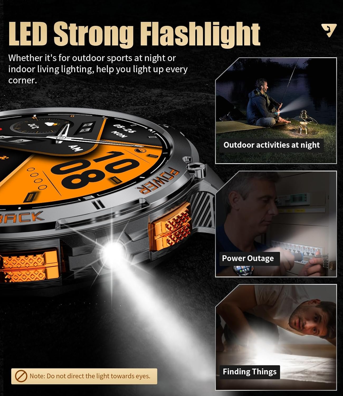 🛰️【Compass & GPS & LED Flashlight】 This smart watch men supports a compass and GPS, as well as satellite systems including GLONASS, Beidou, Galileo, NAVIC, and QZSS, allowing you to accurately track your route during outdoor activities and providing comprehensive support for your adventures. For outdoor enthusiasts, this feature enhances safety and adds more enjoyment to outdoor activities. And the mens smart watch is equipped with a powerful flashlight function suitable for various situations. Whether you’re camping at night, looking for something, or handling an emergency, the flashlight provides ample illumination. (*Note: GPS route tracking should be activated in open areas.)