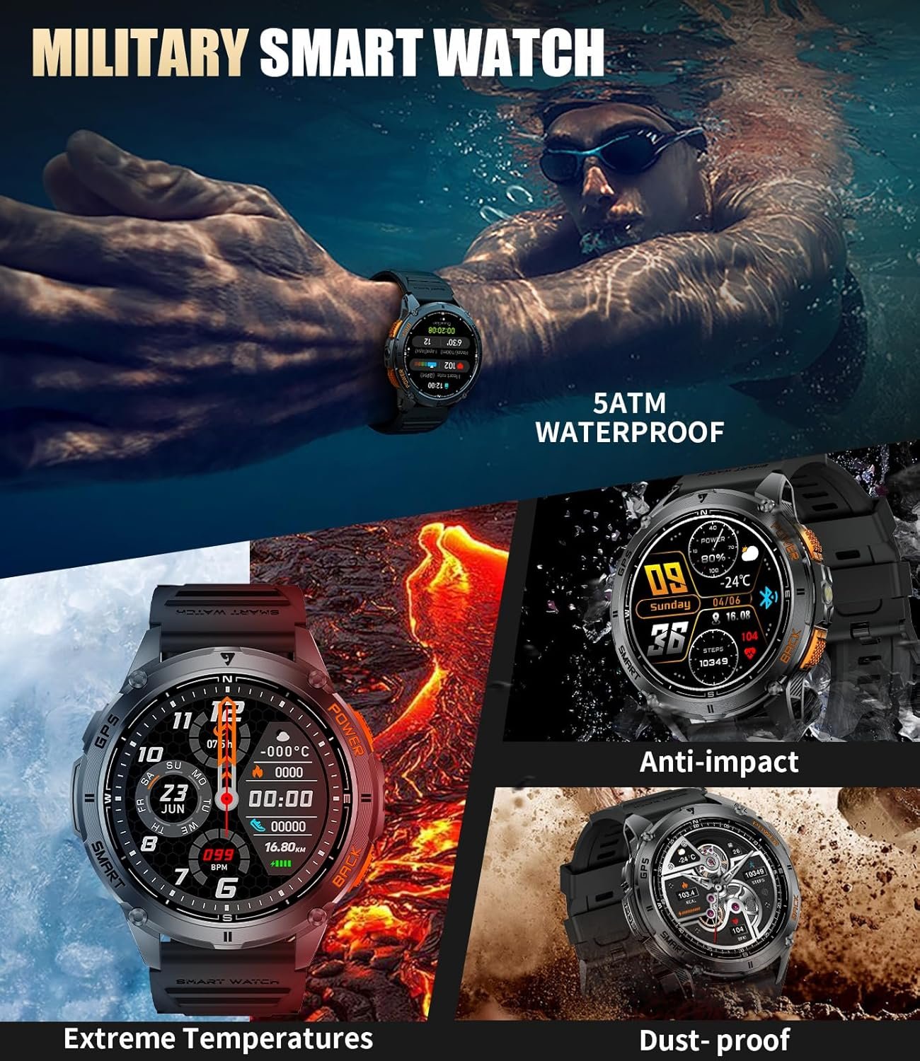 🏊【IP68 Waterproof & Swimming Mode】 This waterproof smart watch has an IP68 water resistance rating, making it capable of handling underwater activities and harsh weather conditions. Whether you’re swimming, surfing, or engaging in outdoor sports in heavy rain, the military smart watch continues to function properly, providing all-day protection for your health data. The swim mode, designed specifically for swimming enthusiasts, accurately tracks your swimming strokes, lap count, speed, and calorie burn. Its waterproof design also ensures the smart watch fitness tracker remains unaffected by splashes or sweat. *Note: Not suitable for diving or sea use.