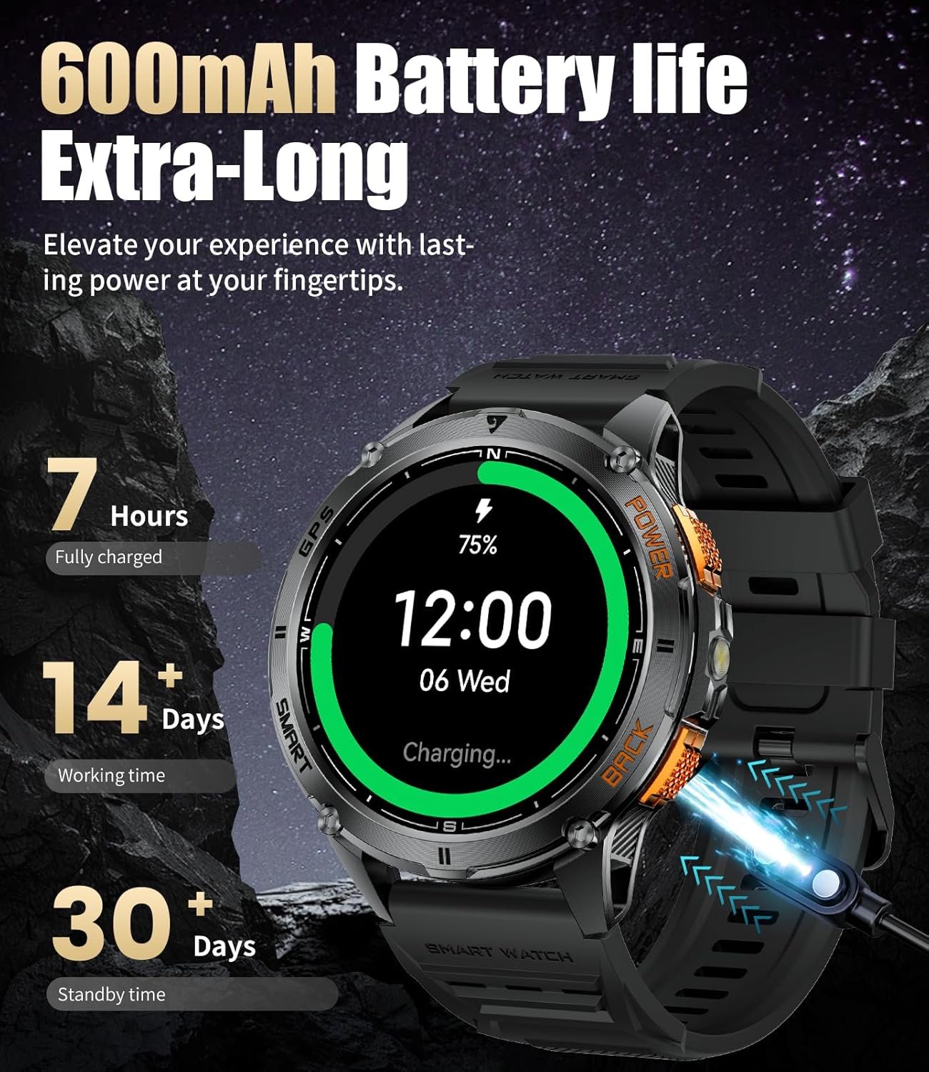 🔋【600mAh Long Battery Life】 This smart watch for iphone compatible not only features built-in GPS and a flashlight, but also offers impressive battery life. Whether you’re on long outdoor adventure or doing daily workouts, the fitness watches for men provides all-day power support. Equipped with 600mAh high-capacity battery and the latest AI-powered power-saving technology, it offers up to 7 days of usage and up to 30 days of standby time under normal use. Even when using high-power features like GPS navigation or the flashlight, the watch still provides a lasting and reliable experience.