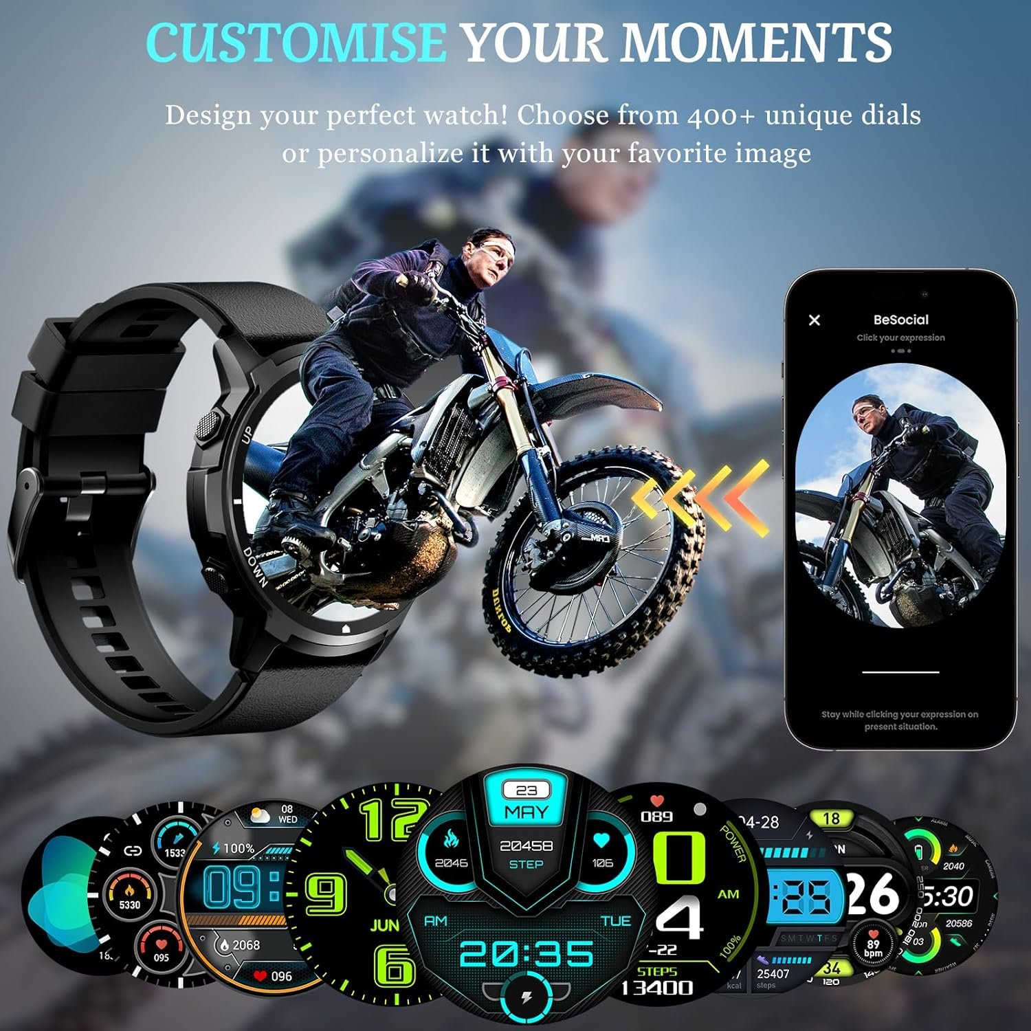 1.43-inch HD Touchscreen Multi-functional Buttons: Features a 1.43-inch HD circular touchscreen (360×360) for crisp visuals and smooth operation. Includes 4 quick-access buttons for easy function control. Choose from 400+ watch faces or customize with personal photos to match your style.For work or leisure, blending convenience and fashion
