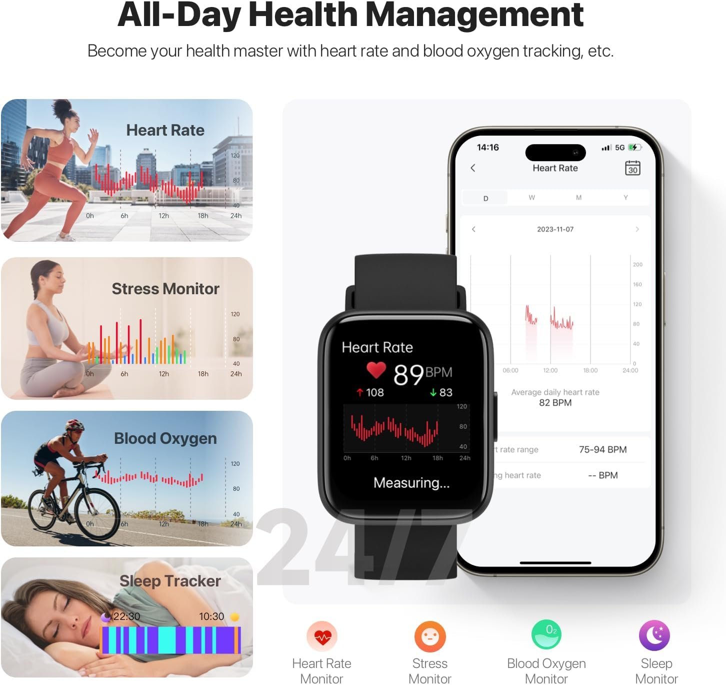 24/7 ACTIVITY TRACKER — Equipped with a Heart Rate Monitor, Blood Oxygen Monitor, and a Stress Monitor to keep an eye on your health around the clock. It also monitors your sleep stages, so you can clearly know the quality of sleep during REM, core sleep or deep sleep. It also synchronizes with a woman’s menstrual cycle to provide predictions and reminders.