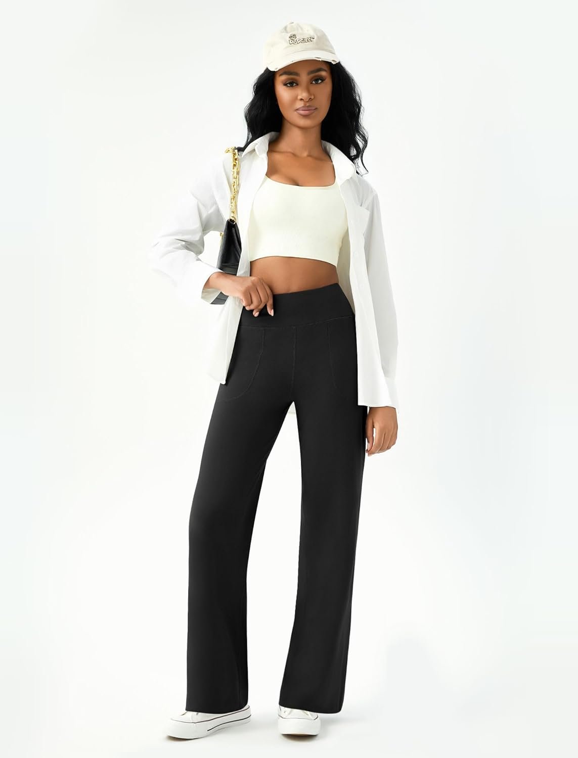 Customers find these yoga pants comfortable and well-fitting, particularly noting they’re suitable for tall women. They appreciate the stylish wide-leg design that can be casual or dressy, and one customer mentions the high waist is super flattering. Customers praise the material quality, with one noting it holds up well after washing, and they like the pockets, with one mentioning they fit phones perfectly. Customers find them lightweight and worth the cost, with one describing them as better than Lulu Lemon.