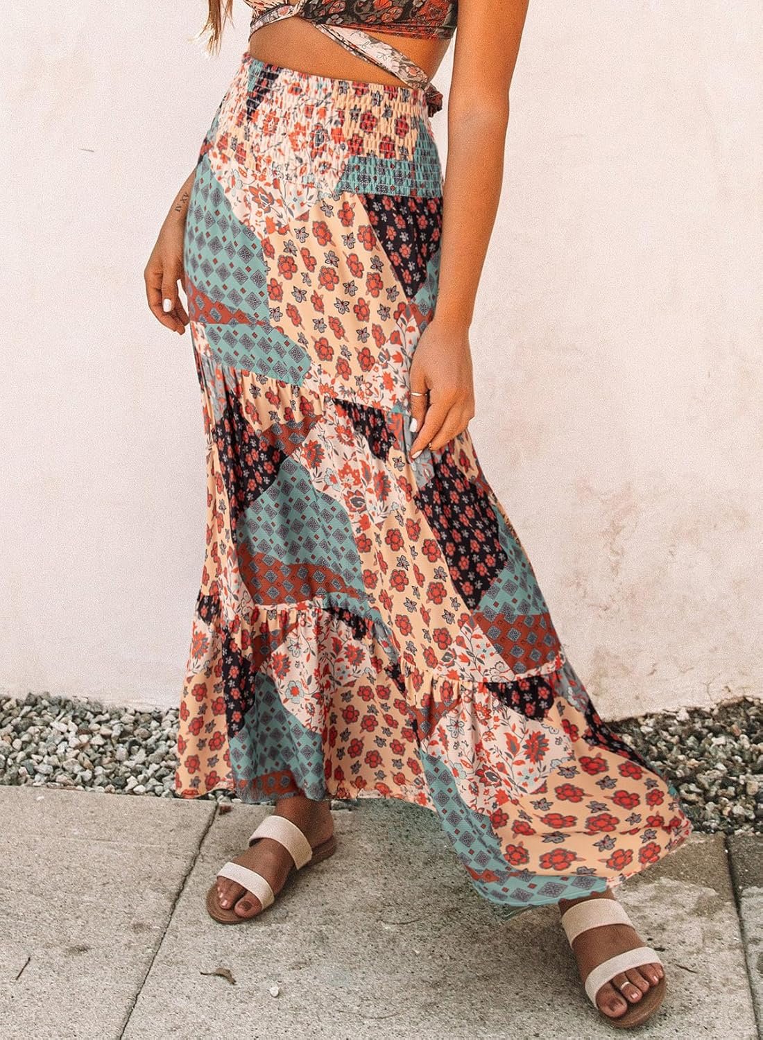 Happy Sailed Womens Floral Print Boho Maxi Skirt Elastic High Waist Pleated Ruffle Flowy Long Skirts S-XL