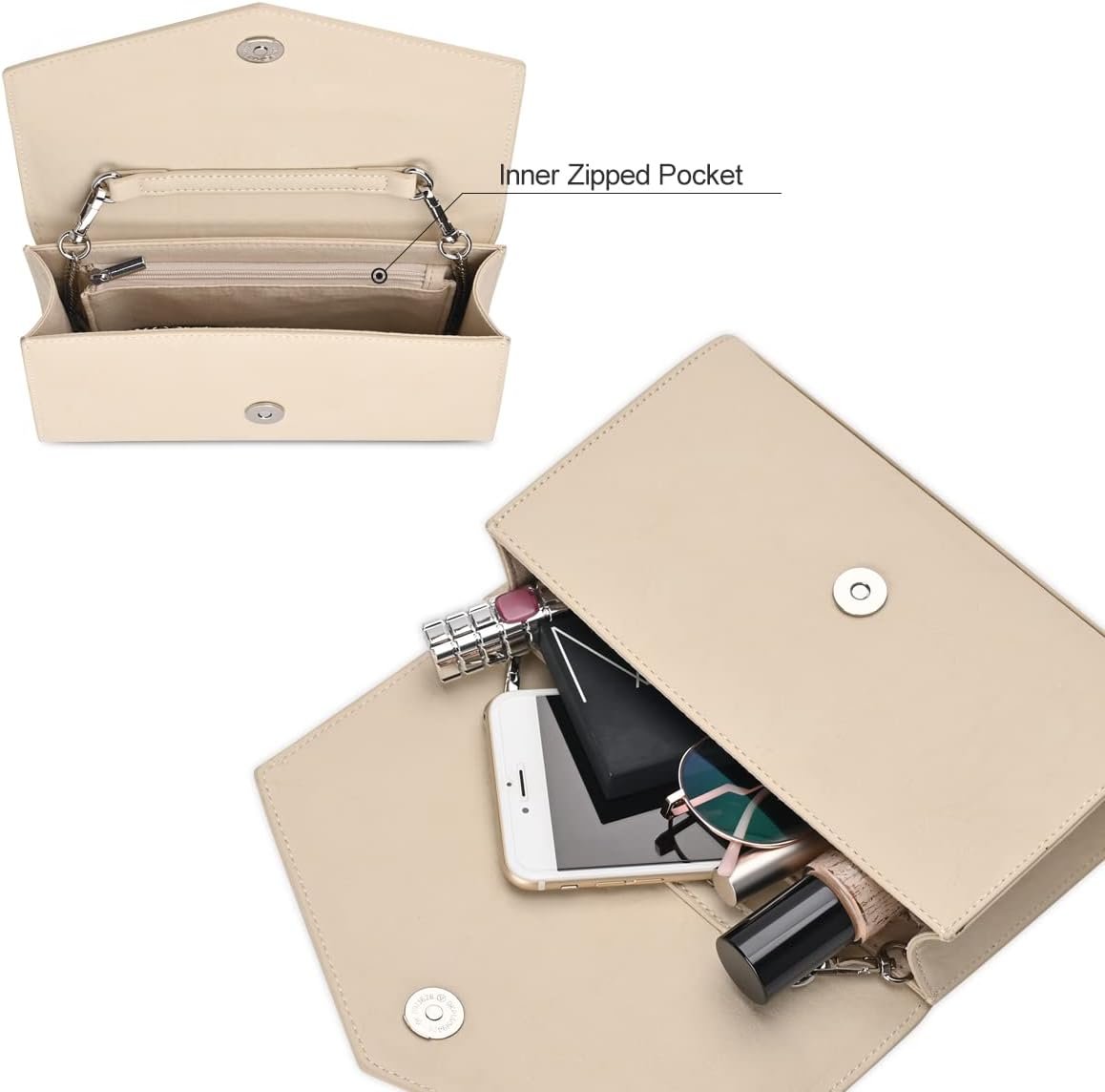 Customers find this clutch purse perfect for weddings, appreciating its great size that holds everything needed for dressing up. The handbag features sturdy PU leather construction and a heavy-duty chain, with one customer noting its soft suede interior. They like its pretty color, simplicity, and smooth texture.