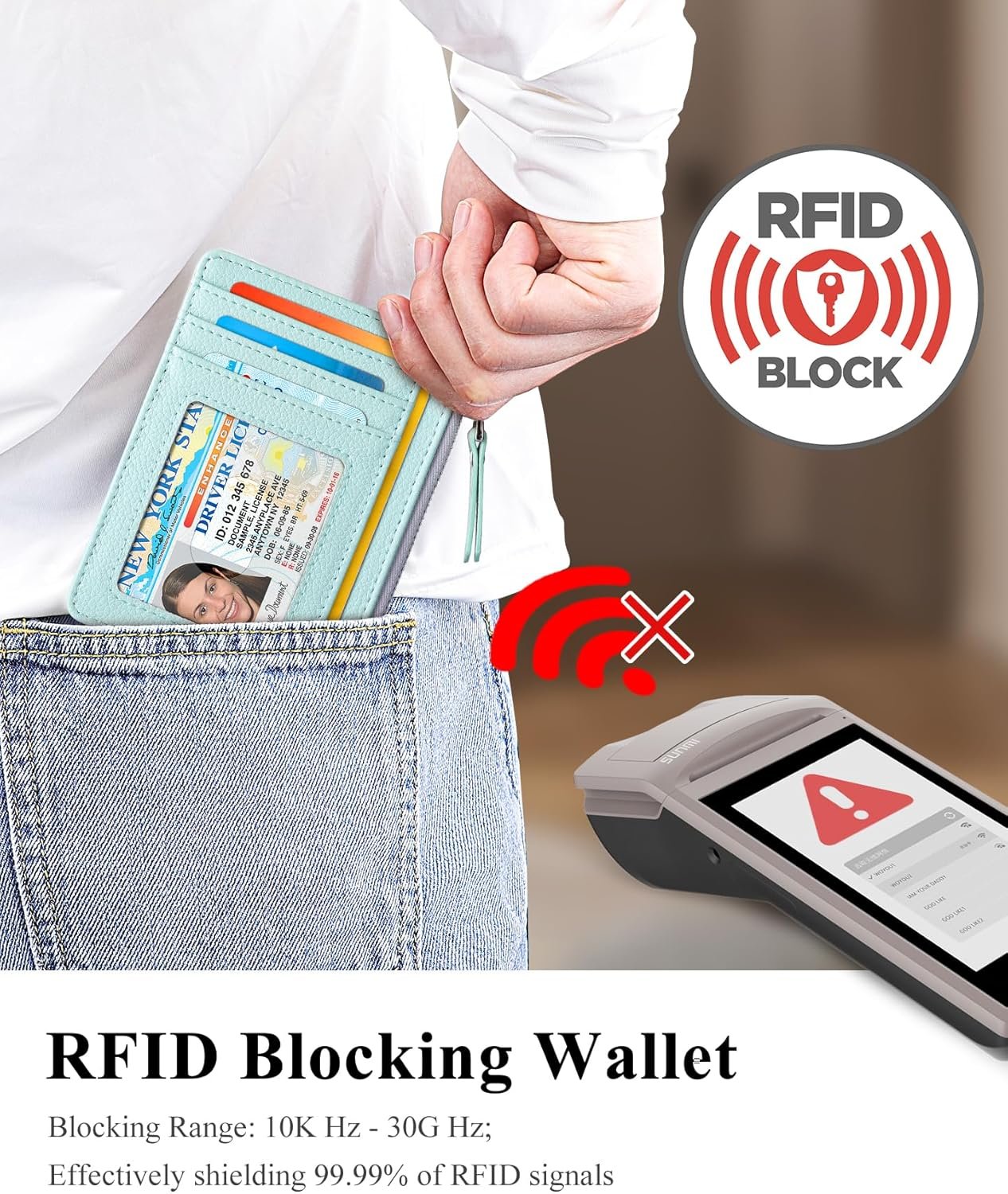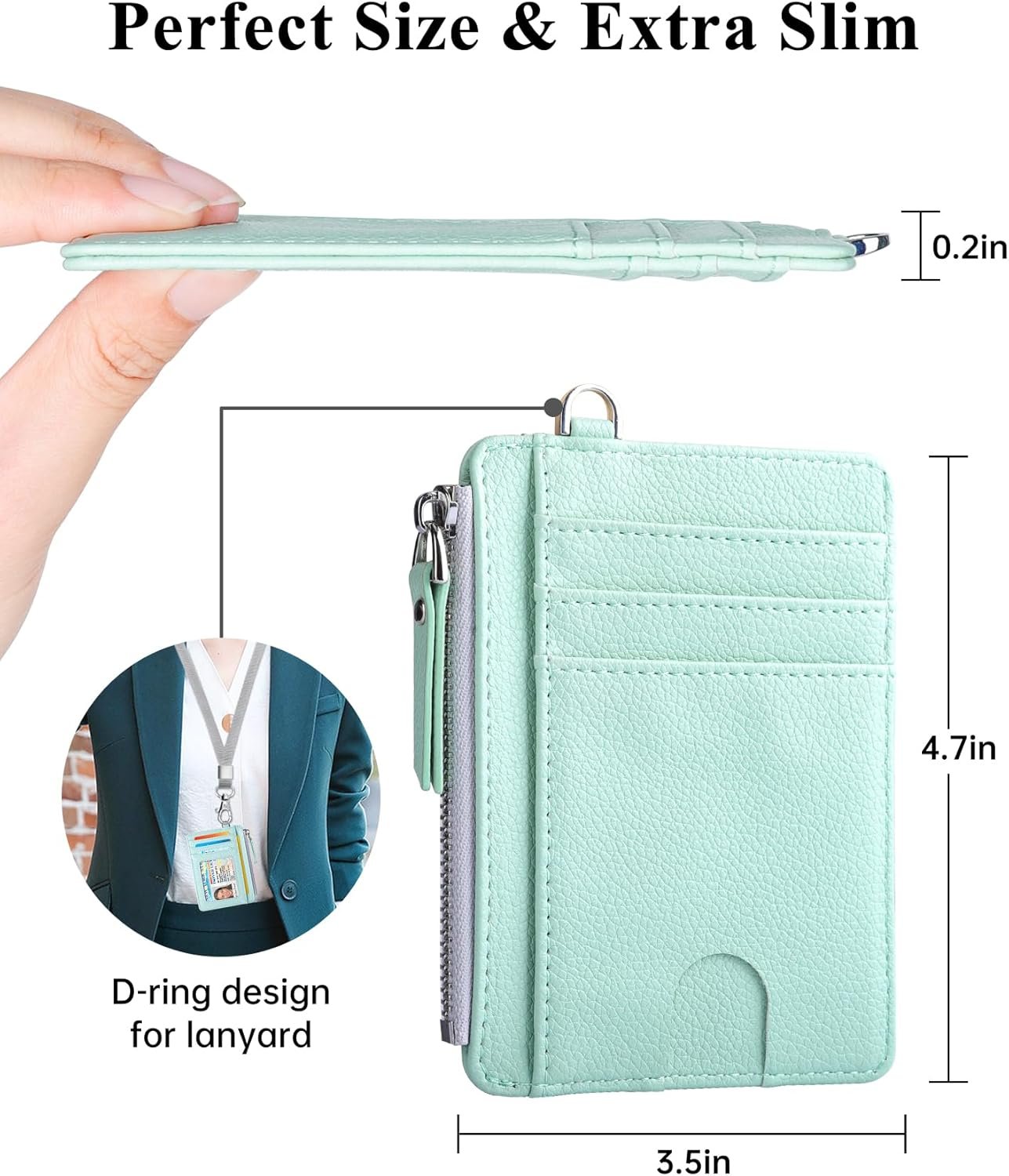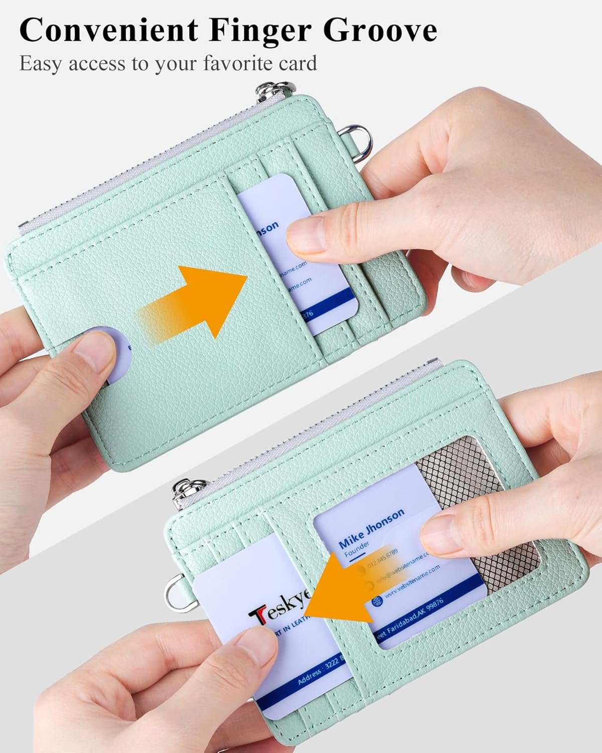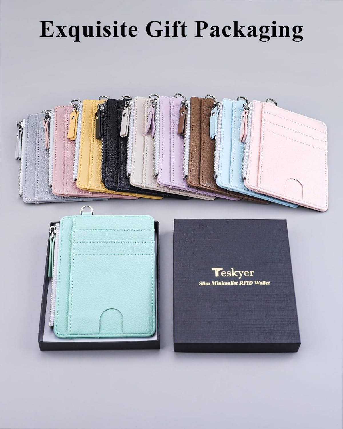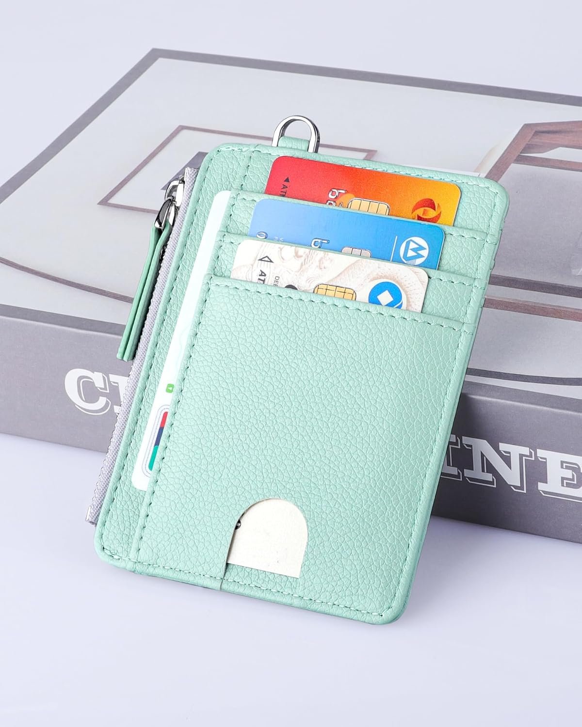 Teskyer Slim Minimalist Wallet, RFID Blocking Credit Card Holder Leather Wallet with Zipper Pocket for Men Women – Lichee Light Green