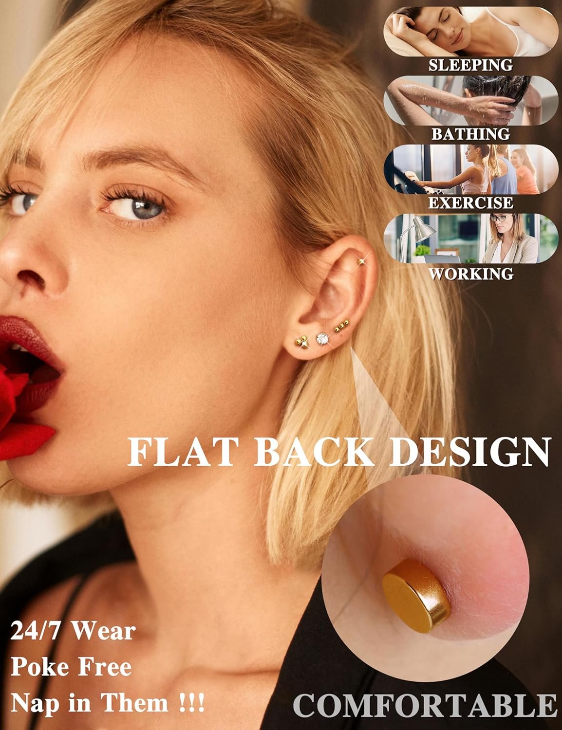 LOLIAS Small Hypoallergenic Flat Back Stud Earrings for Women Men 14K Gold Plated Surgical Stainless Steel Earring Sets Tiny Screw Back Cartilage Earring