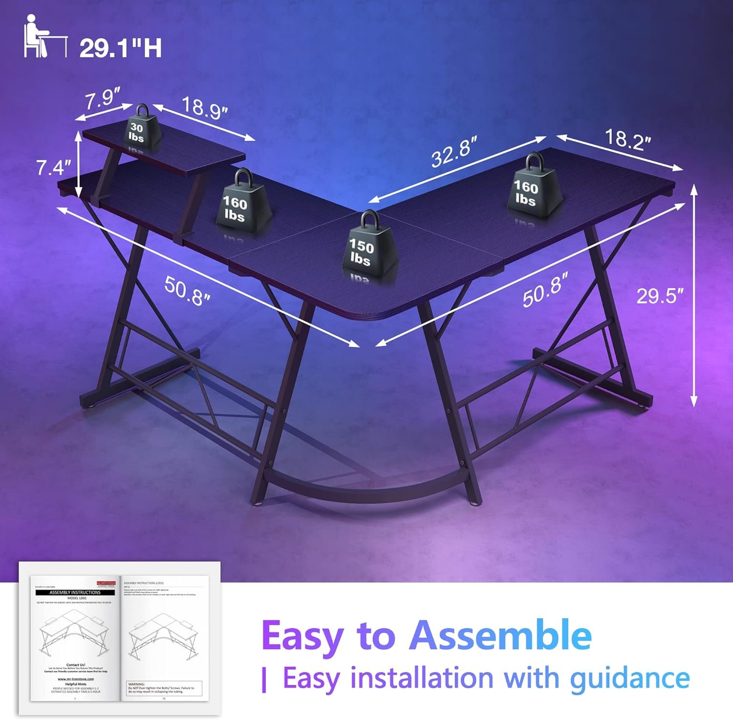 Easy to assemble & Express Services: Hassle free & Time Saving Installation for the L shaped computer desk. Mr IRONSTONE provides every l shaped desk with detailed assembly instructions and necessary tools. Fairly easy to assemble within 35 minutes, providing you with an easy and pleasant shopping experience.