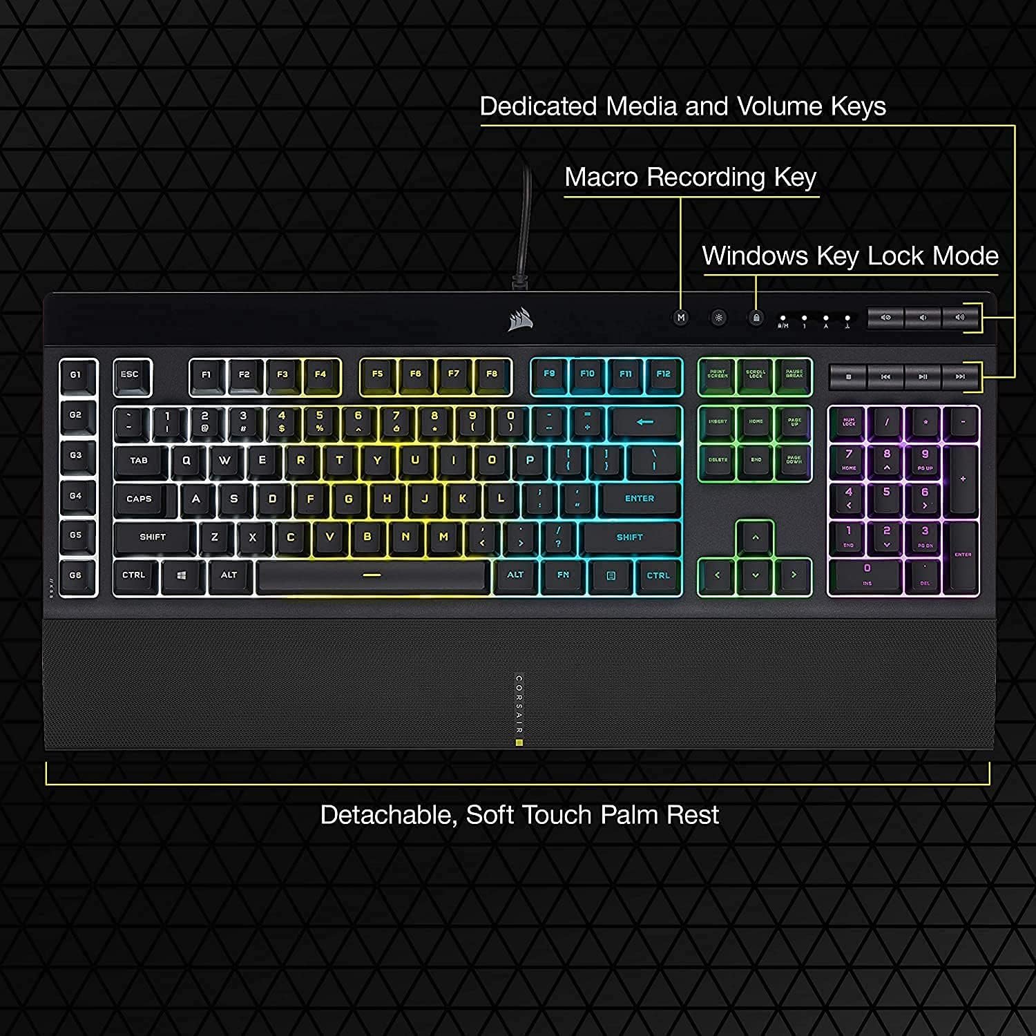 The CORSAIR K55 RGB PRO Gaming Keyboard lights up your desktop with vibrant five-zone dynamic RGB backlighting and powers up your gameplay with six easy to set up dedicated macro keys. The K55 RGB PRO is certified for IP42 dust and spill-resistance to stand up to wear, tear, and more, with a detachable palm rest to ensure all-day comfort. Quiet and responsive keys are comfortable for typing or gaming, and dedicated media keys put play, pause, and more within easy reach. CORSAIR iCUE software makes it easy to personalize your lighting and macros, while anti-ghosting and selective key rollover ensure your critical inputs are delivered when they matter most.