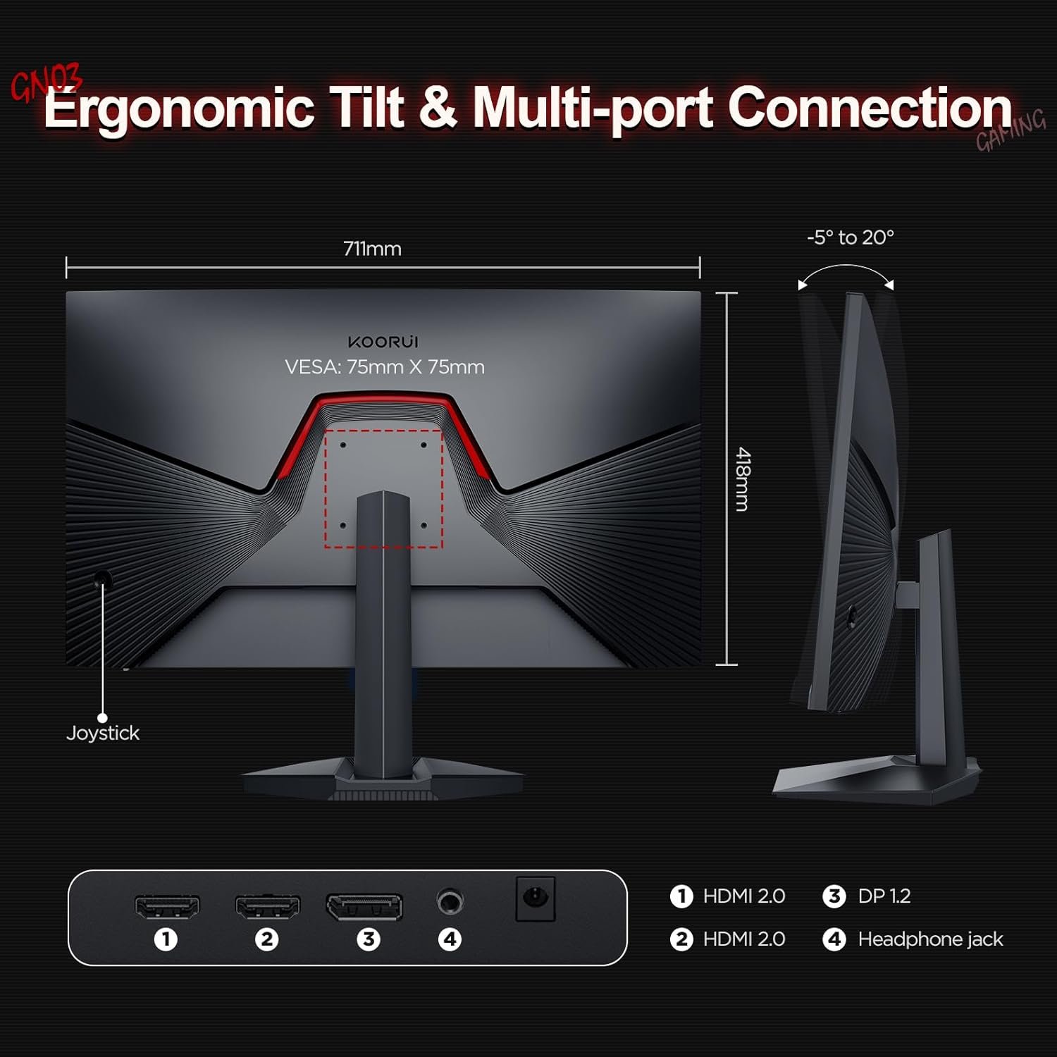VESA Mounting Compliant(75*75mm)| Ergonomic Tilt: -5° to 20°