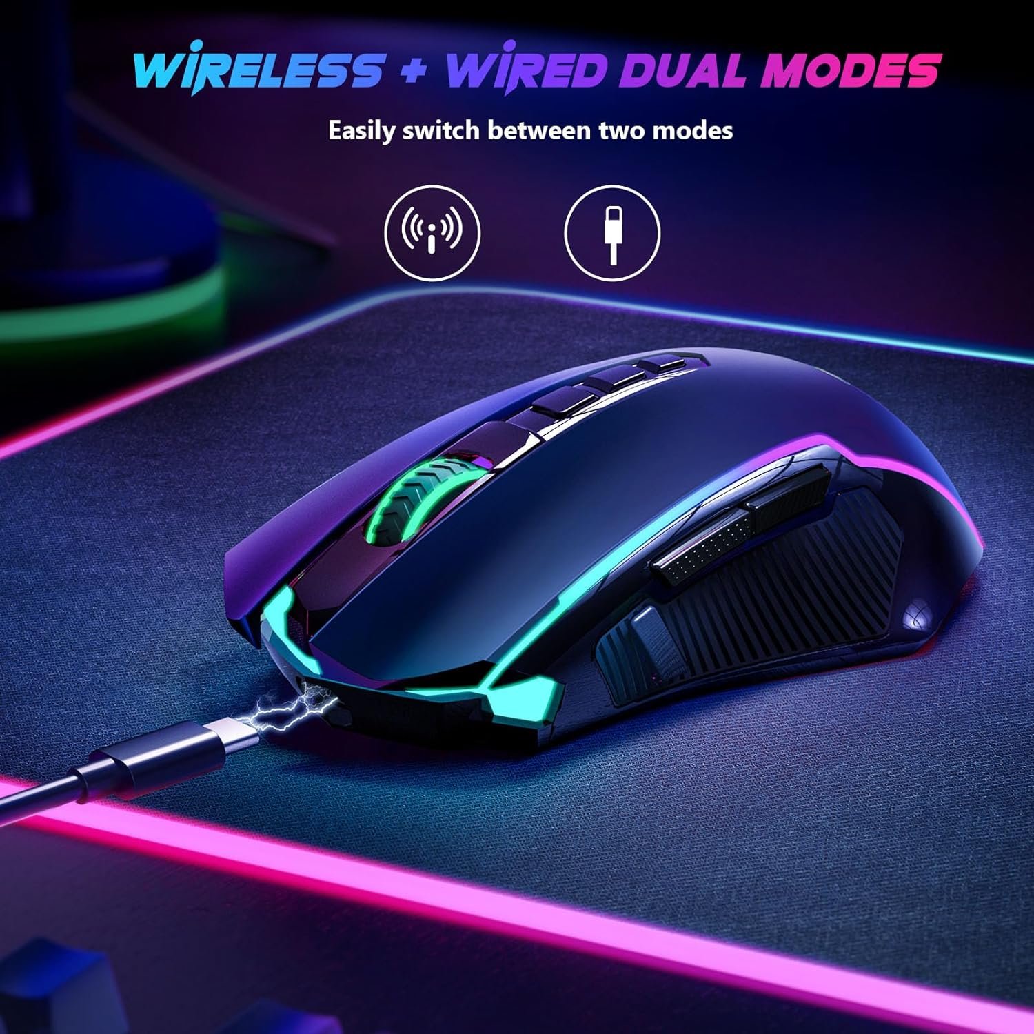 【High-Precision Gaming Mouse】-The wireless mouse features adjustable DPI(250-8000) and 4 adjustable polling rates ( 125Hz/250Hz/500Hz/1000Hz), you can easily adjust the moving speed, and experience a smooth, fast response and accurate tracking gaming experience. The fire button(✈1 click = 3 clicks) gives you the edge you need during those intense FPS battles.