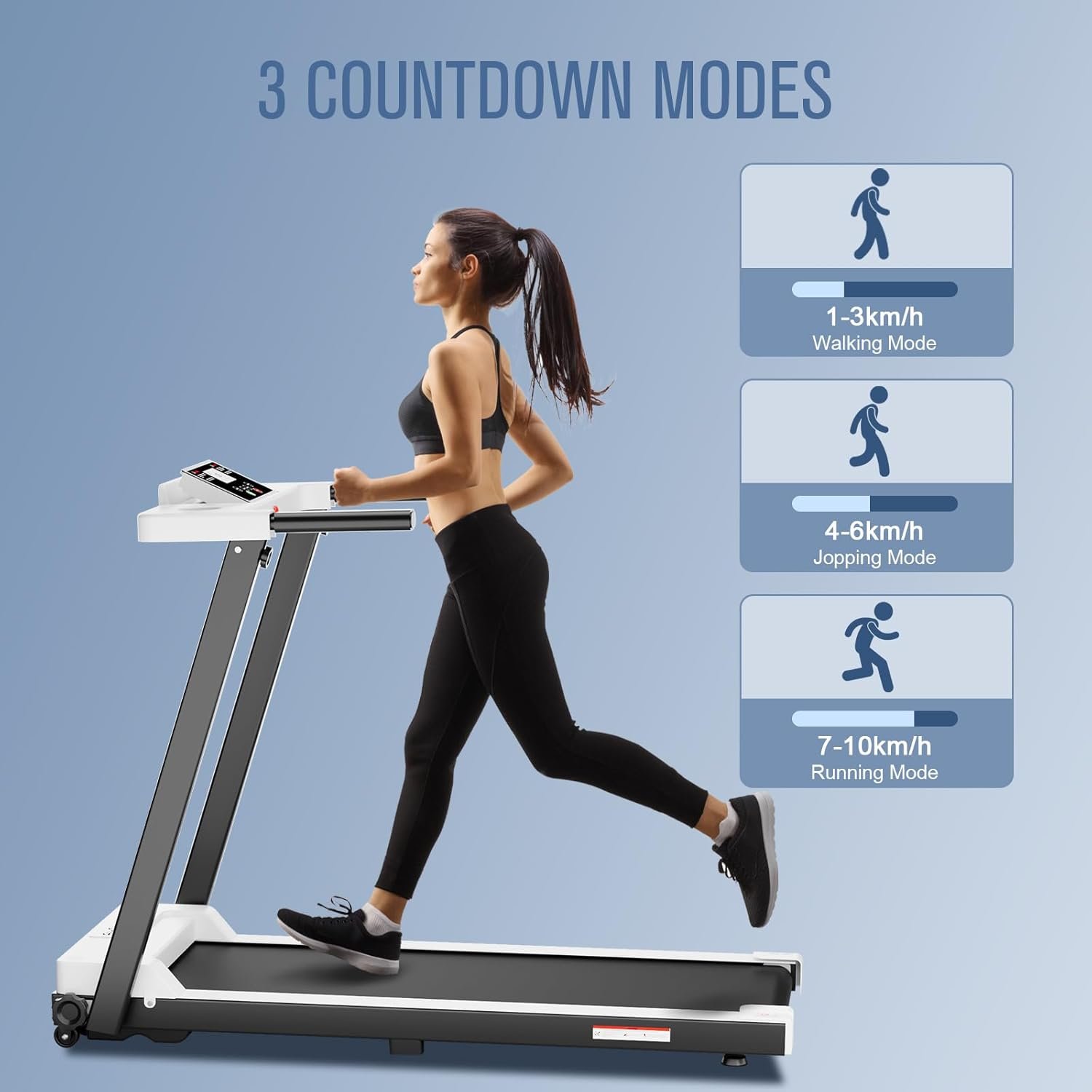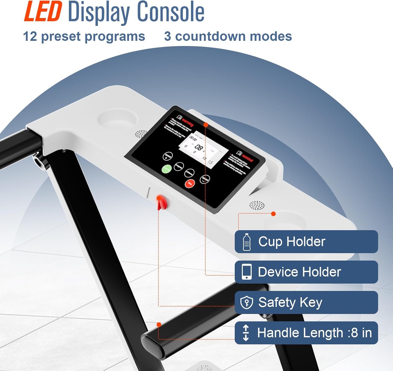 Best Fat-Burning Mode: The FitinOne folding treadmill features 12 HIIT running modes and 3 control modes, allowing you to choose the best training plan for your needs. The adjustable LED screen clearly tracks speed, time, distance, and calories, making your workouts easy to monitor. It also includes a cup holder, tablet/phone holder, safety key, and armrests for convenient exercise.