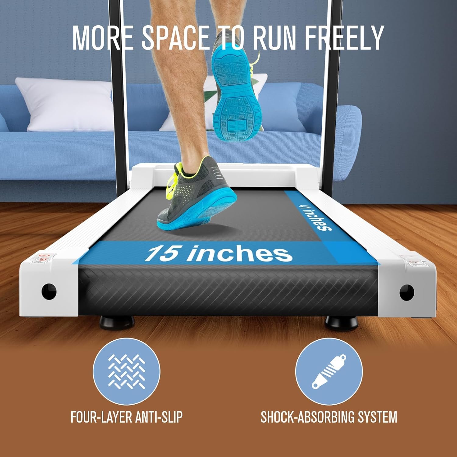 Larger Running Area: The treadmills for home small has a spacious 15 x 41-inch 4-layer shock-absorbing non-slip running belt, offering ample exercise space and comfort while minimizing joint impact. It features a non-slip running area for a quieter workout, ensuring a comfortable experience for you, your family, and even your pets. It doubles as a pet treadmill, allowing everyone to stay active on the FitinOne portable treadmill.