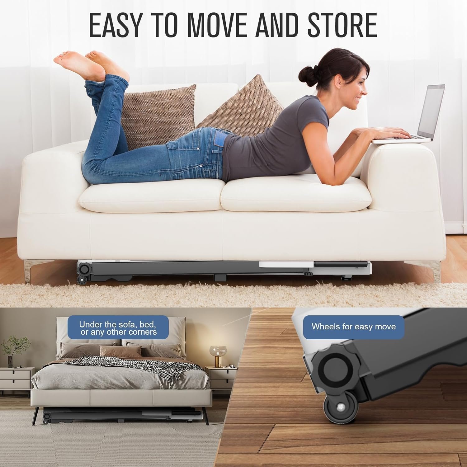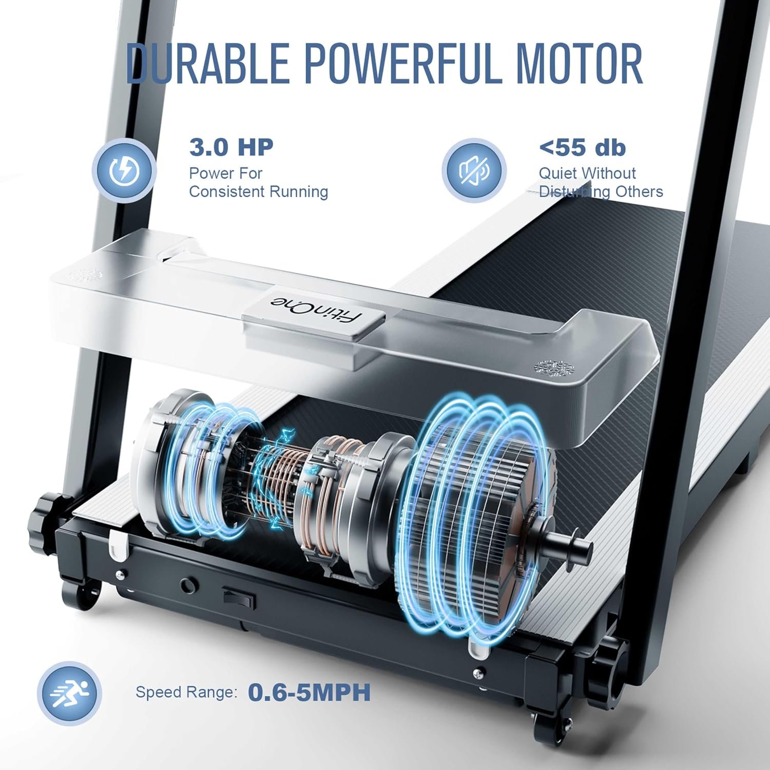 Space Save: FitinOne portable treadmill features knobs and wheels for easy folding, moving, and storage. It comes mostly pre-assembled with all tools, parts, lubricant, and instructions in one box for a quick 5-minute setup. Folding this walking treadmill down takes just two steps to a compact size of 48L x 22W x 5.5H inches, making it convenient to store under beds or sofas, ensuring quick access for your workouts.
