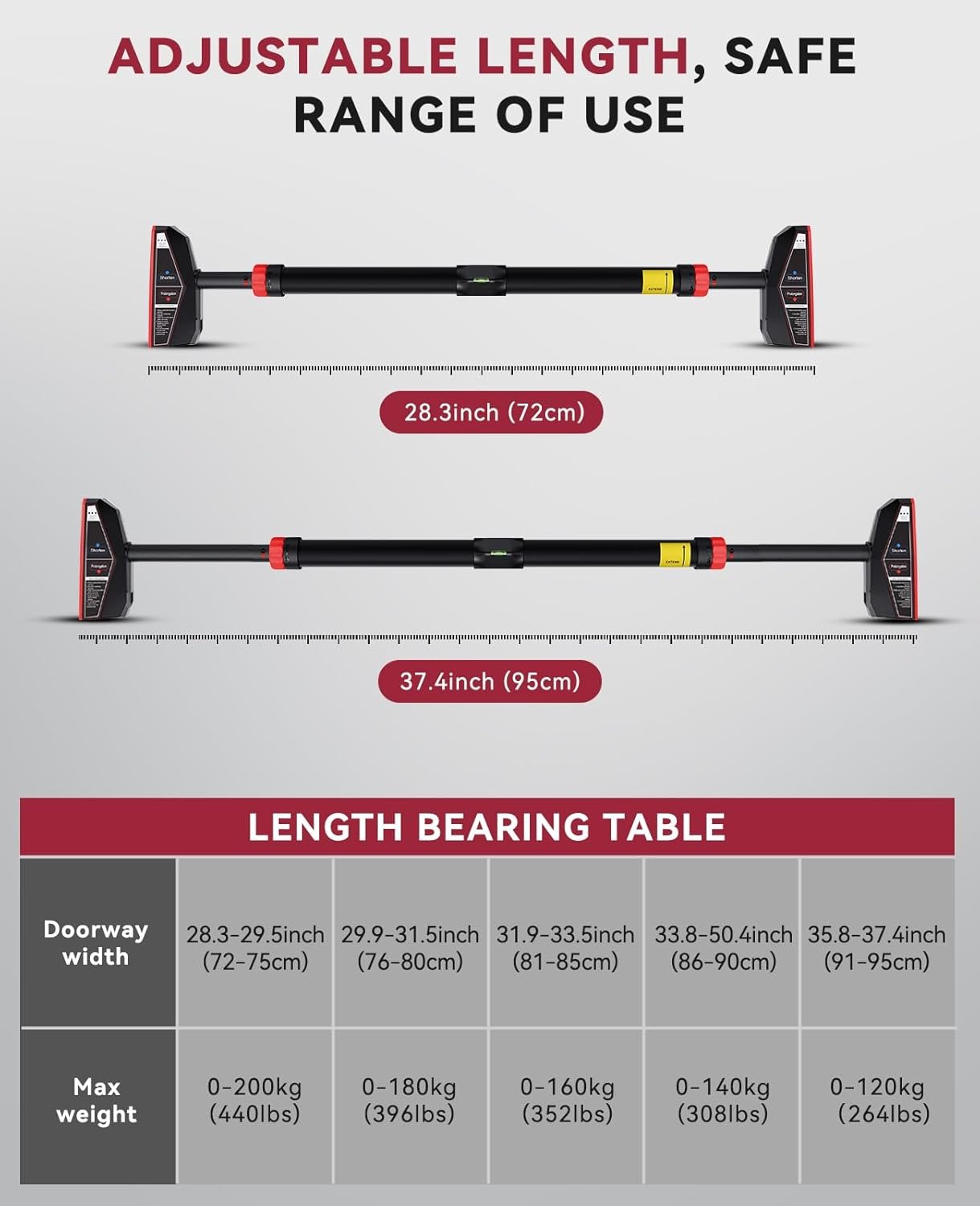 【Adjustable Width & Comfortable Grip】Featuring an adjustable width from 72cm to 95cm (28.3in-37.4in), this Pull-up Bar for Doorway accommodates various door frames while ensuring a snug fit. The high-quality EVA foam handles provide superior comfort and grip, allowing you to focus on your workout without discomfort or slipping.