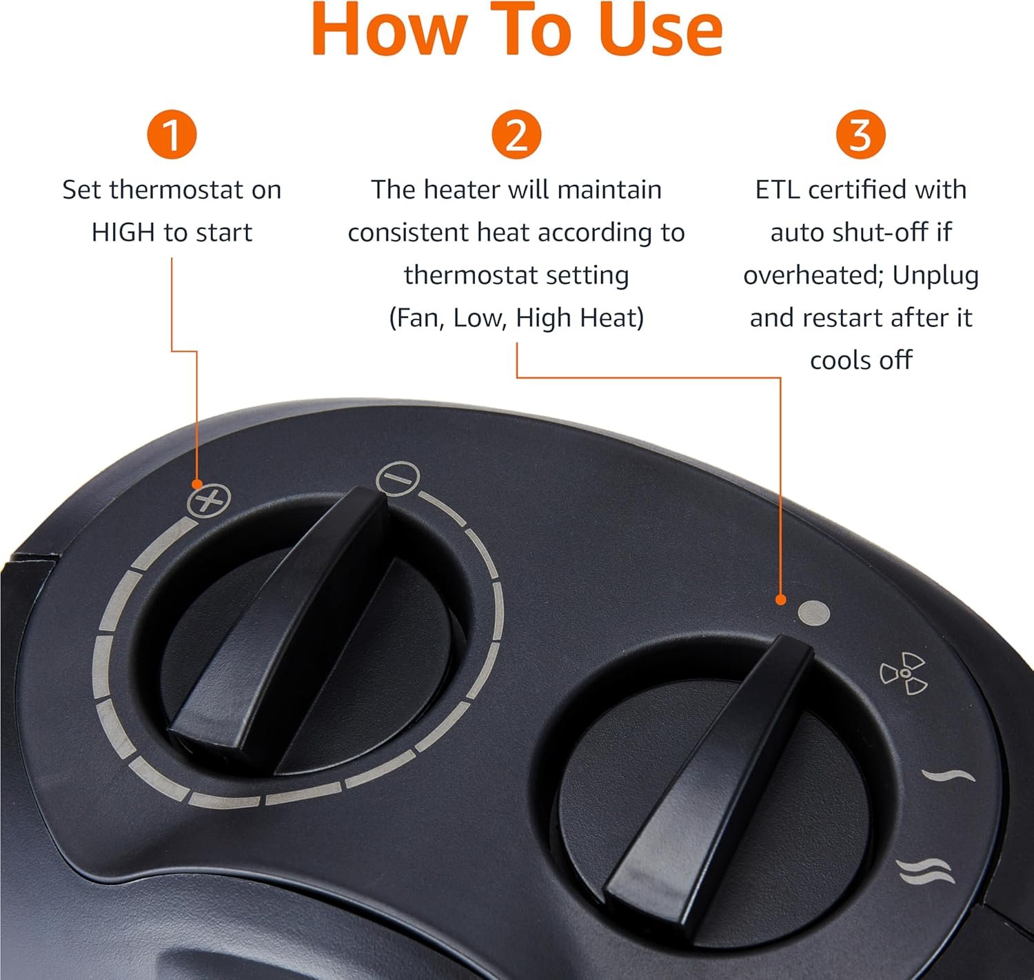Amazon Basics Ceramic Space Heater, Portable Heater for Indoor Use, for Office and Home, With Overheat and Tip-Over Protection, Thermostat, Non-Oscillating, 1500W, Black, 7.52″D x 6.34″W x 9.45″H