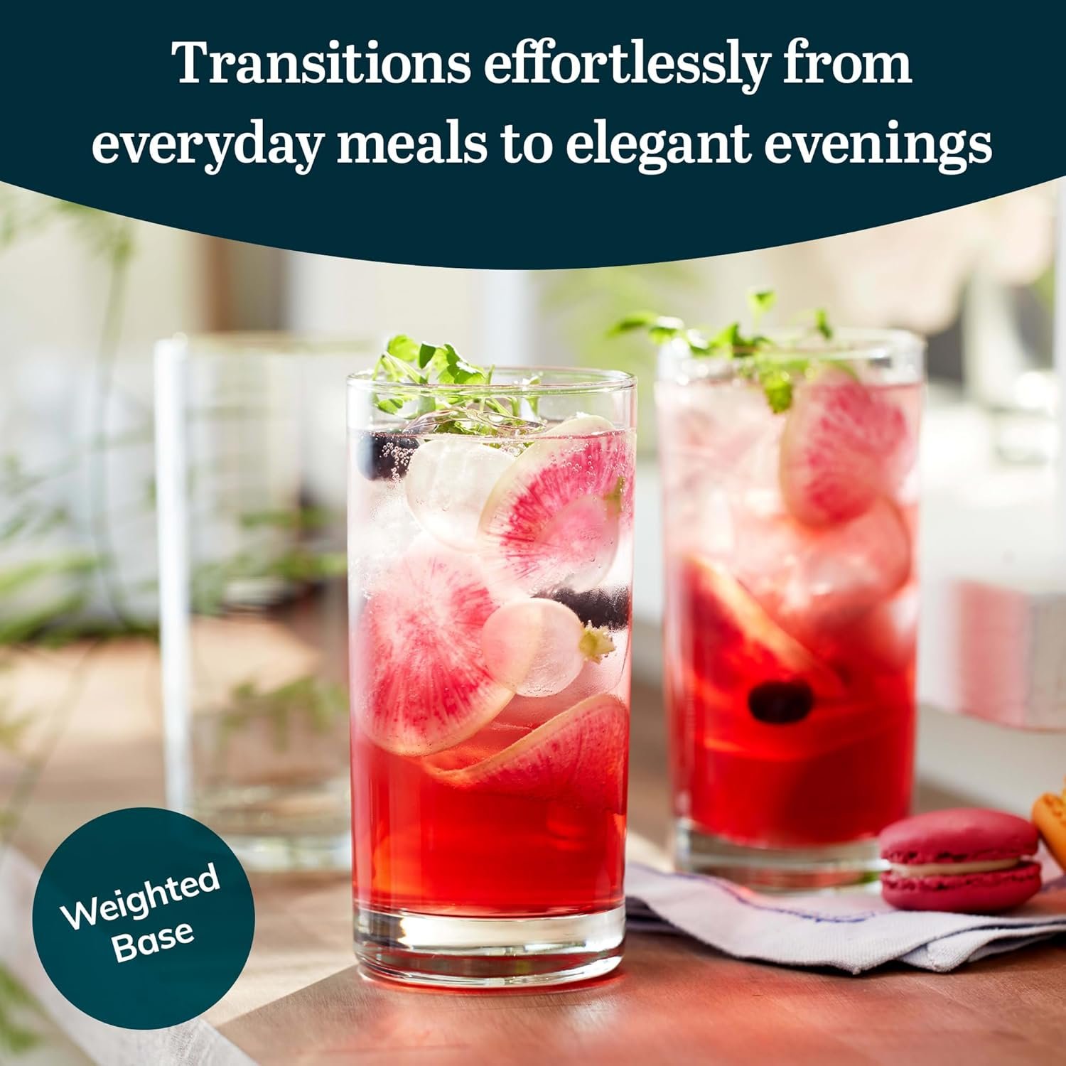 Sophisticated Drinking Glasses Sets: Elevate your drinking experience with a powerful touch of elegance and style with our weighted base water glass set. These kitchen glasses have a space-saving design that fits neatly in cupboards or open shelving