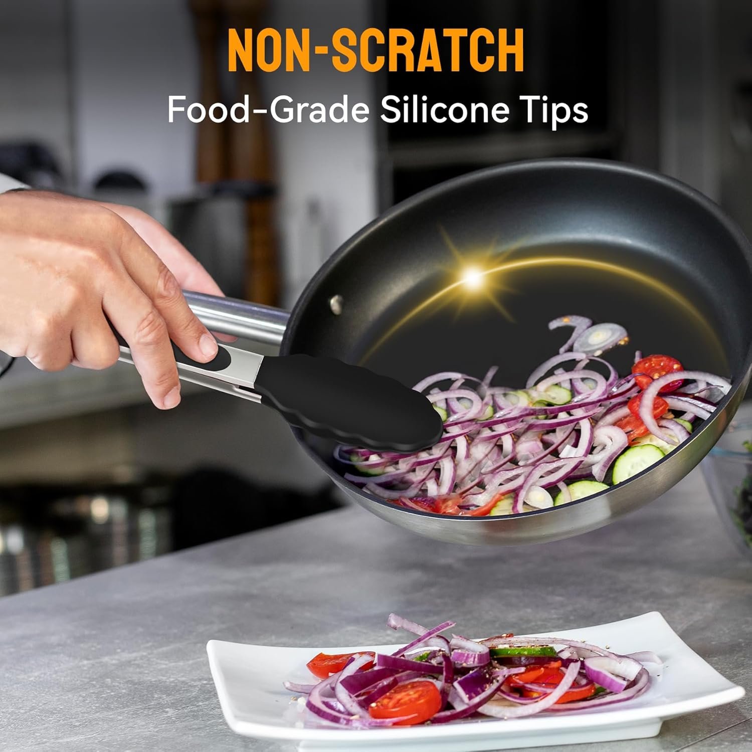 EASY TO USE: The handle is cushioned with silicon, good for thumb rest and ensures good grip and control. The silicon tong tip is heat resistance and less prone to scratch the pan. Easy to rinse, dishwasher safe.