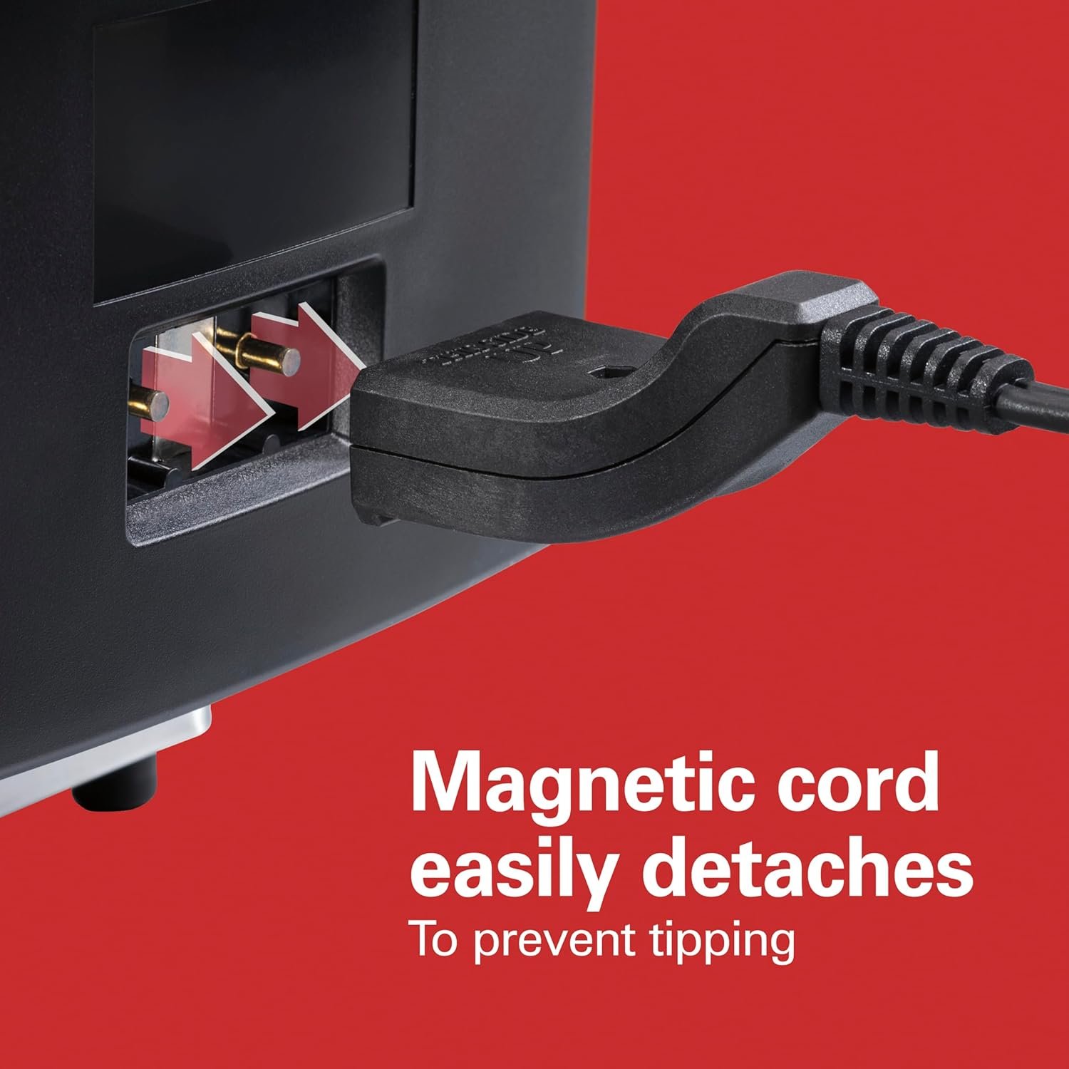 Magnetic cord easily detaches. If the cord gets snagged on the deep fryer for the home, the cord instantly detaches from the deep fryer to prevent tipping.