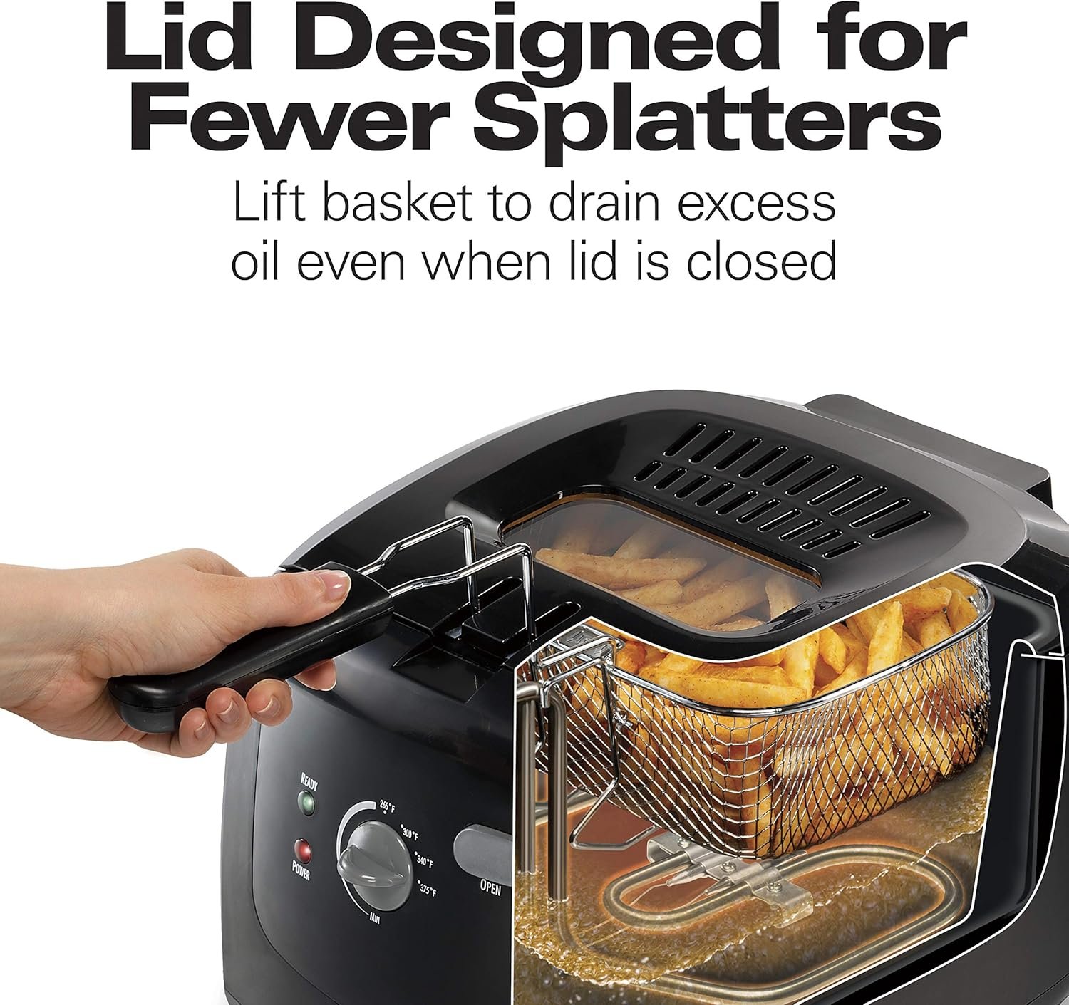 SPECIAL LID DESIGN FOR FEWER SPLATTERS: Cook with the lid on for less mess—you can even lift the basket out of the oil to drain it while the lid is still closed.
