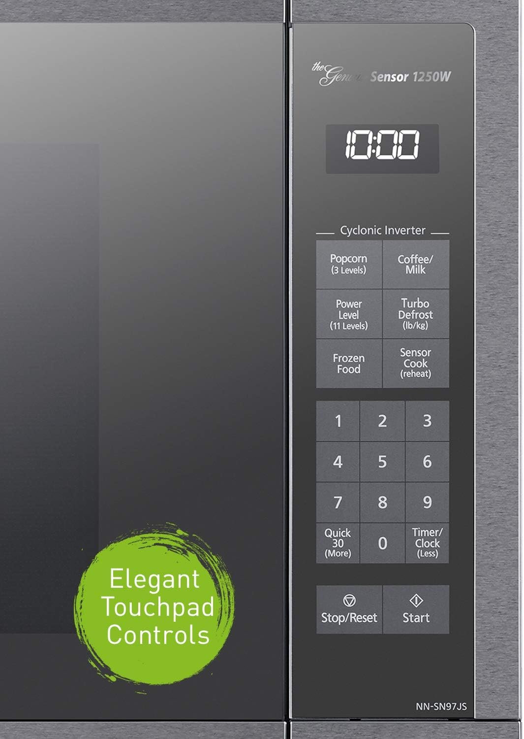When it comes to everything you expect in a microwave, nothing compares with the defrosting, cooking and reheating capability of the Panasonic NN-SN97JS Countertop/Built-In Cyclonic Wave Microwave Oven with Inverter Technology and Genius Sensor. At every temperature level, Cyclonic Wave circulates heat in precision, ultra-efficient 3D waves for easier, more versatile food preparation–even with denser, more complex food textures. This exceptional 1250-Watt, 2. 2-cubic-foot capacity stainless steel microwave with 16. 5-inch turntable also includes patented Inverter Technology which, unlike traditional microwaves that rely on pulse-on, pulse-off power at lower temperatures, delivers a constant stream of cooking power at every temperature for more evenly cooked meals – edges to centers – every time. With the touch of the Genius Sensor cooking button, this microwave takes guesswork out of creating a great meal by automatically setting power levels and adjusting cooking or defrosting time for added time-saving convenience. The sensor measures the amount of steam produced during cooking and signals the microprocessor to calculate the remaining cooking time at the appropriate power level. A selection of 20 auto cook options enable you to quickly prepare your favorite foods, such as pizza, popcorn, pasta, soup, oatmeal and other dishes. This Panasonic microwave oven externally measures 14″ x 23 7/8″ x 19 7/16″ (H x W x D).