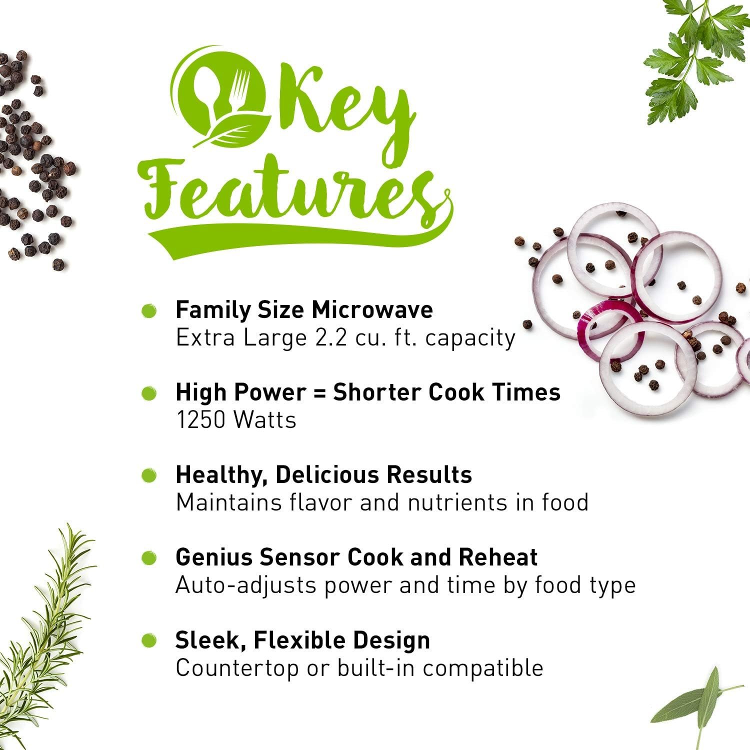 INVERTER TECHNOLOGY WITH TURBO DEFROST: patented Inverter Technology generates a seamless stream of power and delivers consistent, evenly prepared food without overcooking; advanced Inverter Turbo Defrost speeds up defrosting time