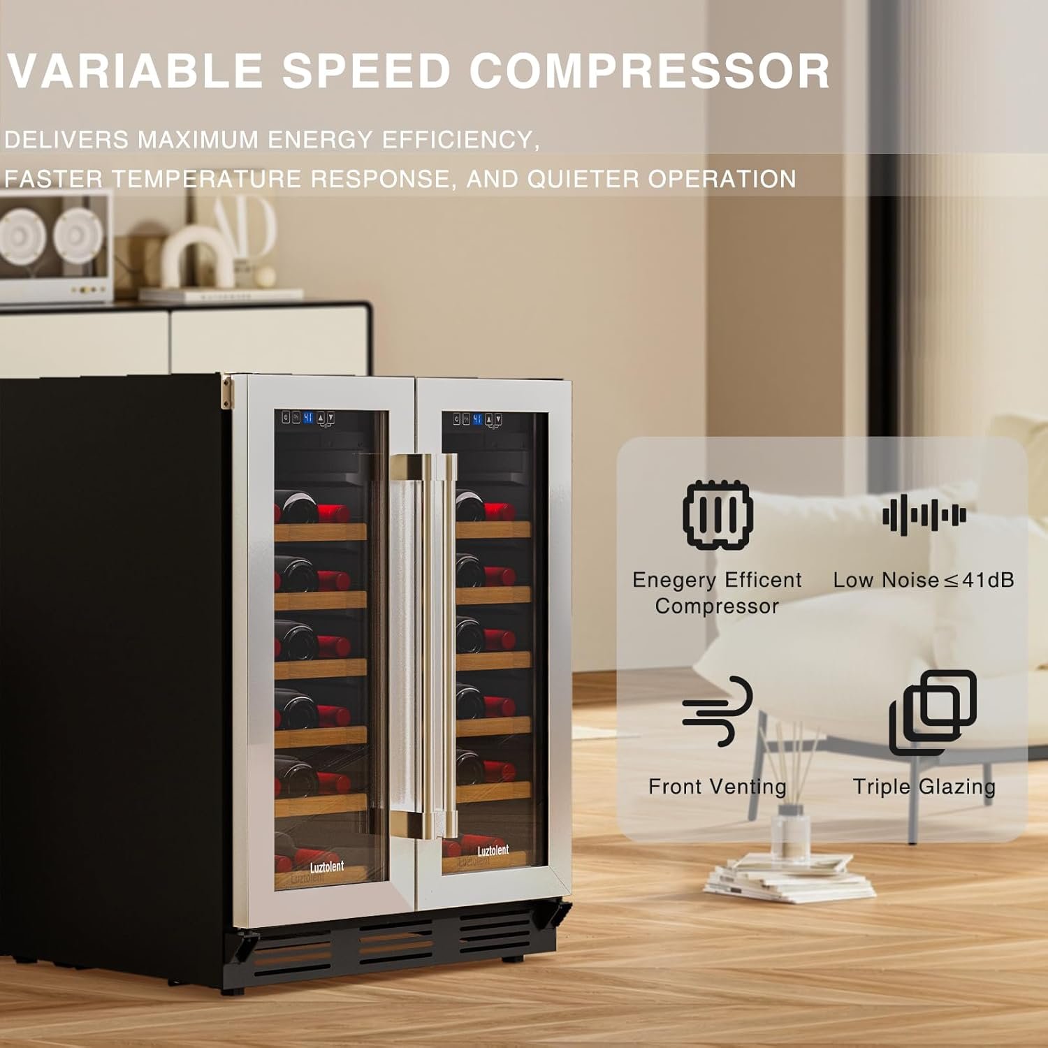 Double Door & Dual Zone Storage: The Luztolent features a counter-opening french door design with dual temperature zones, allowing you to set independent temperatures for each side between 41°F and 64°F, ensuring the ideal preservation of all your wine varieties