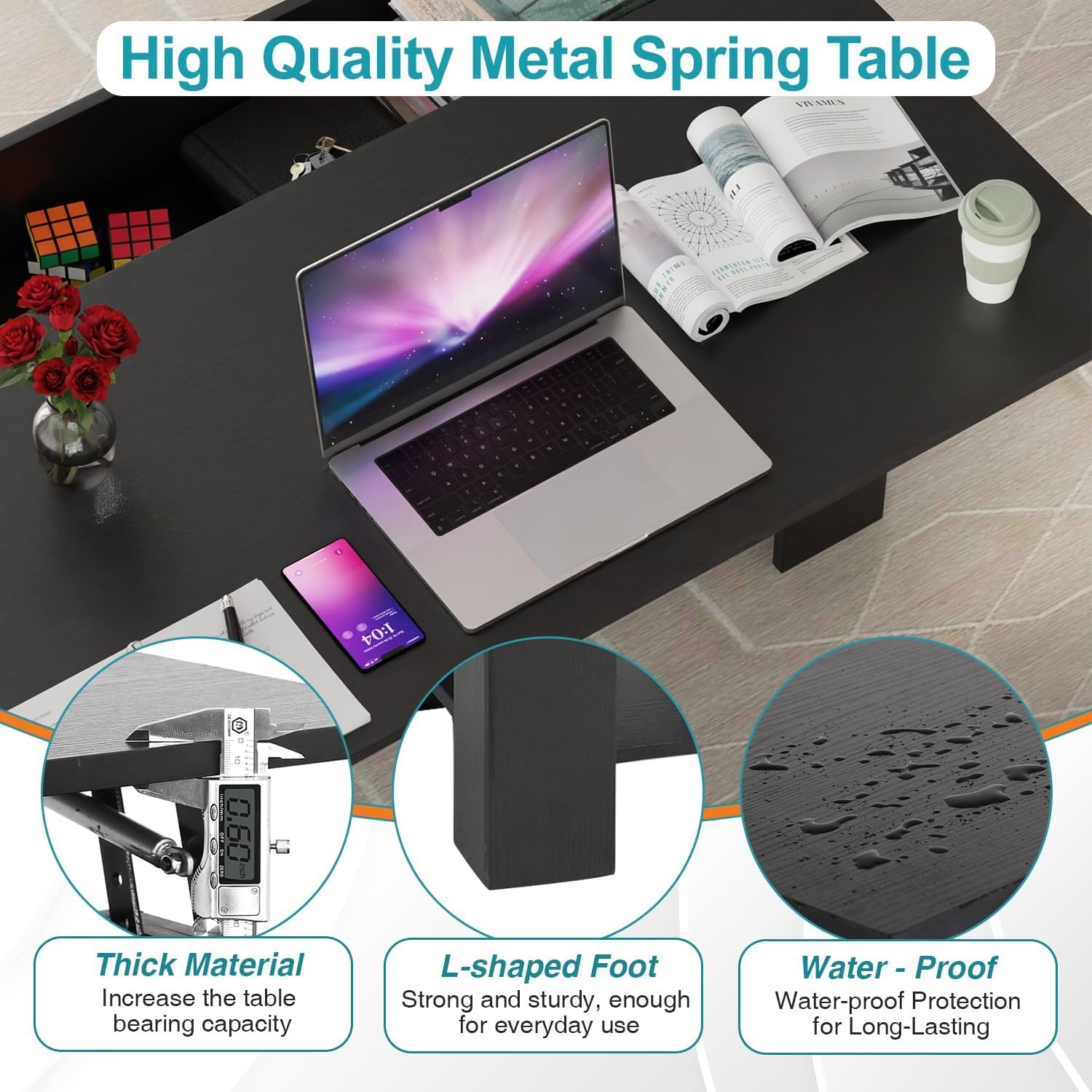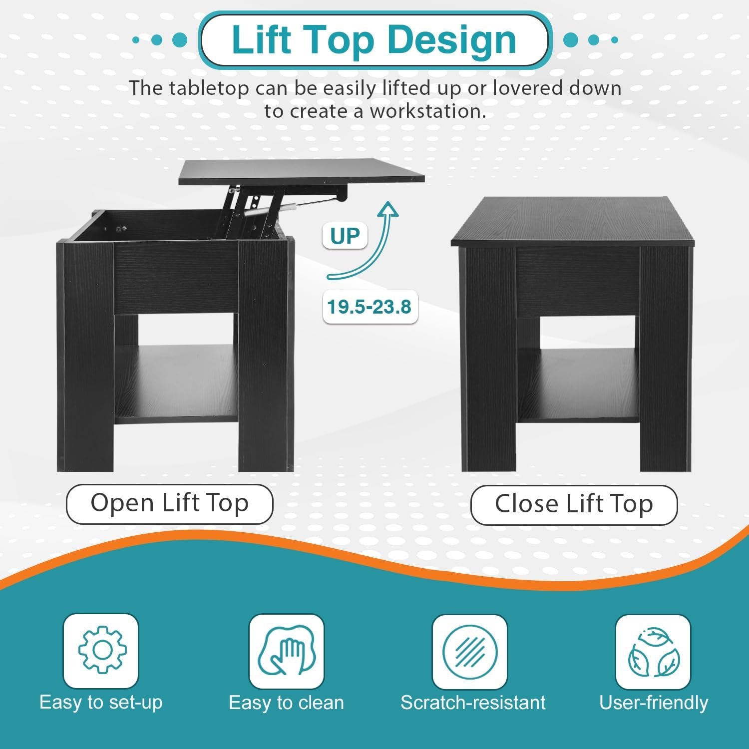 【Lift-up Table Top Design】: The Wooden Lift Top Coffee Table features a clever lift top design, transforming from a stylish coffee table into a convenient workspace or dining surface, all with a gentle touch thanks to its premium soft-close hinges. Say goodbye to noisy openings!